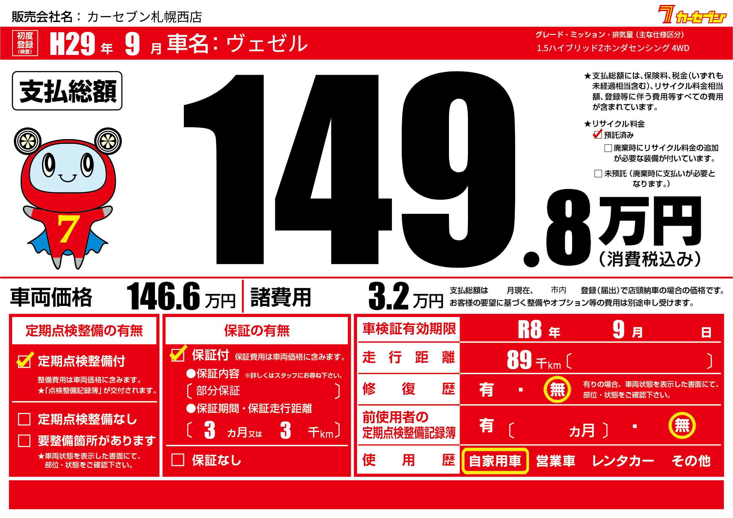 なし | 車検制限 | R8年9月---月 |