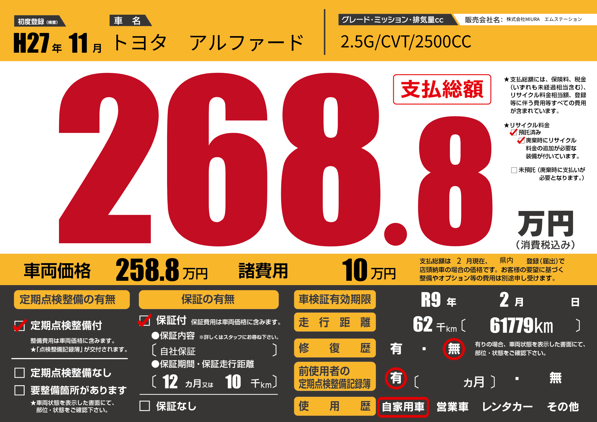 | 車検制限 | R9年 2月 - 日 | ||