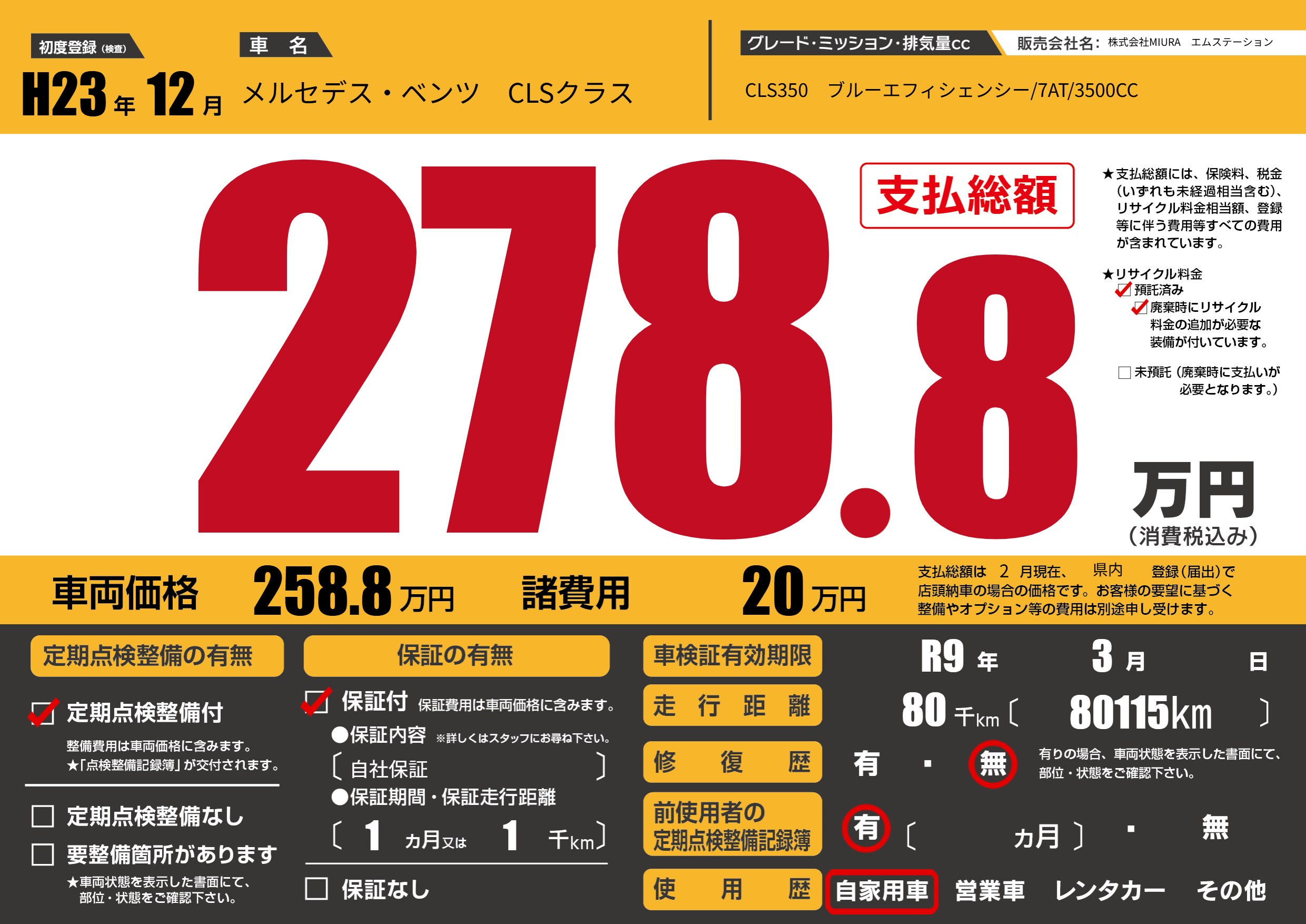 | 車名 | メルセデス・ベンツ CLSクラス | グレード ミッション 排気量 |