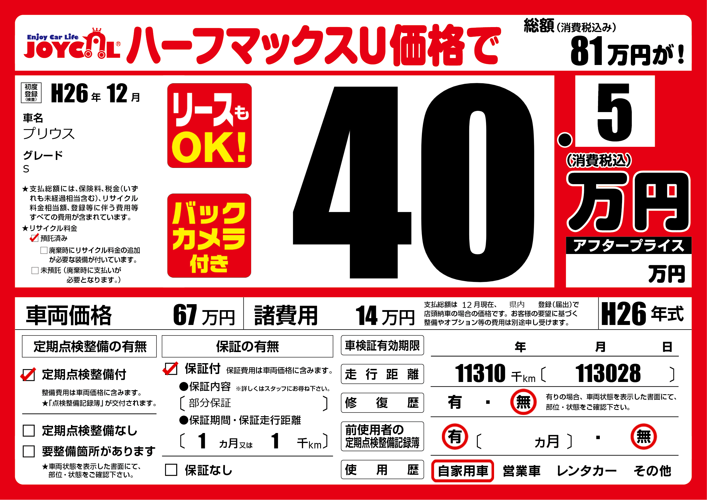 | 走行キロ | 1131万km | 初年度登録 | H26年12月 |