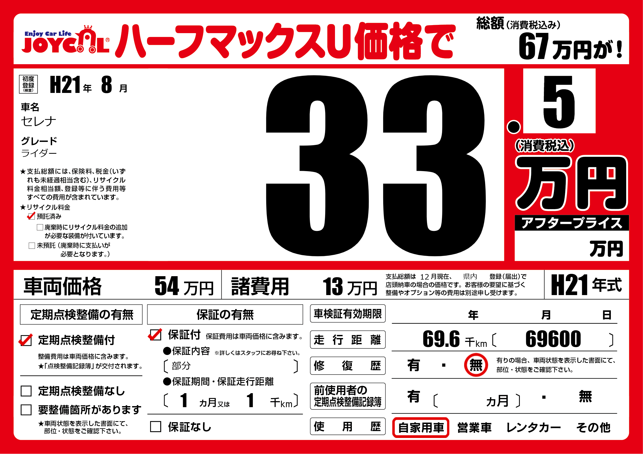 | 走行キロ | 6.9万km | 初年度登録 | H21年8月 |