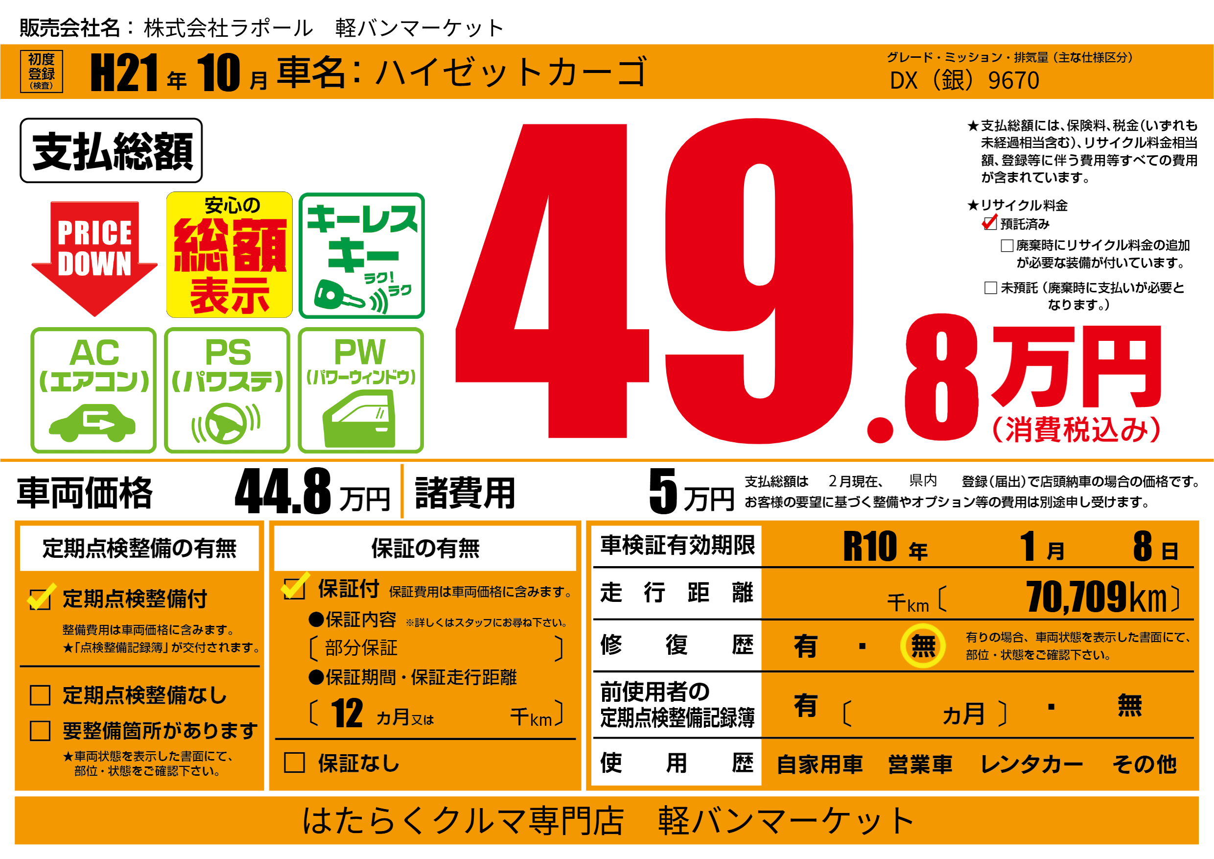 あり | リサイクル預託金相当額 | ( 0円)が別途必要 |