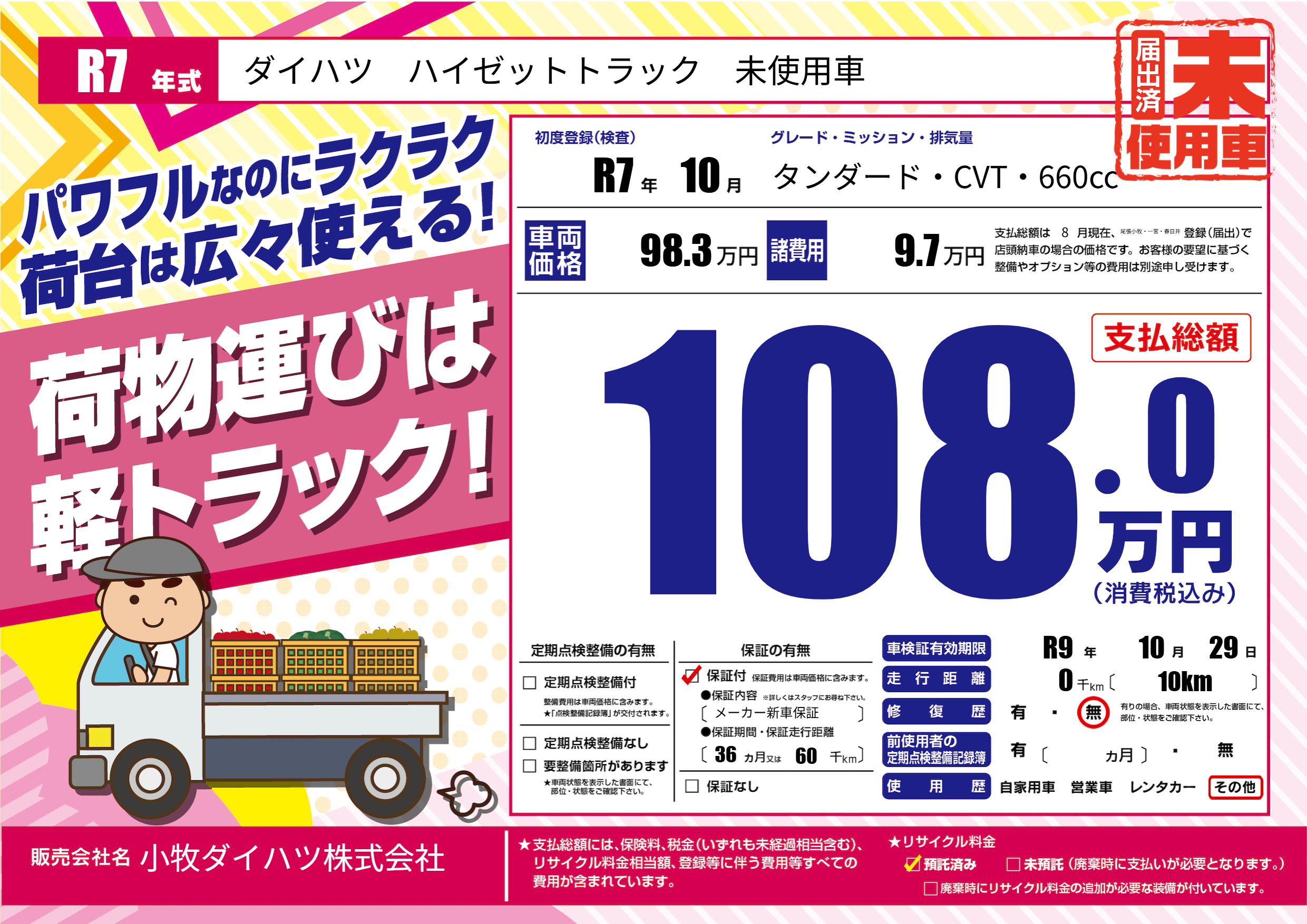 | 車名 | ダイハツ ハイゼットトラック 未使用車 | グレード ミッション 排気量 |