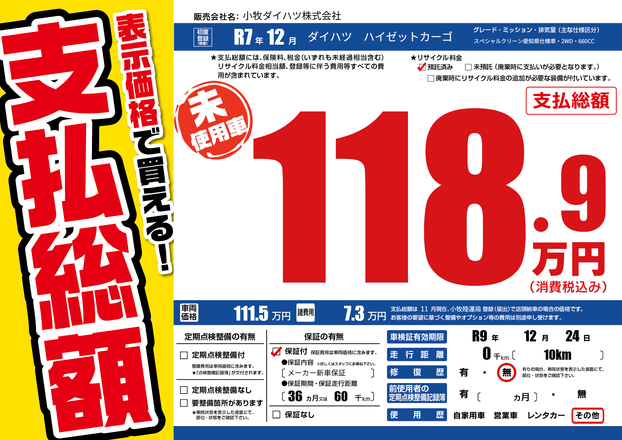 | 走行キロ | - | 初年度登録 | R7年12月 |