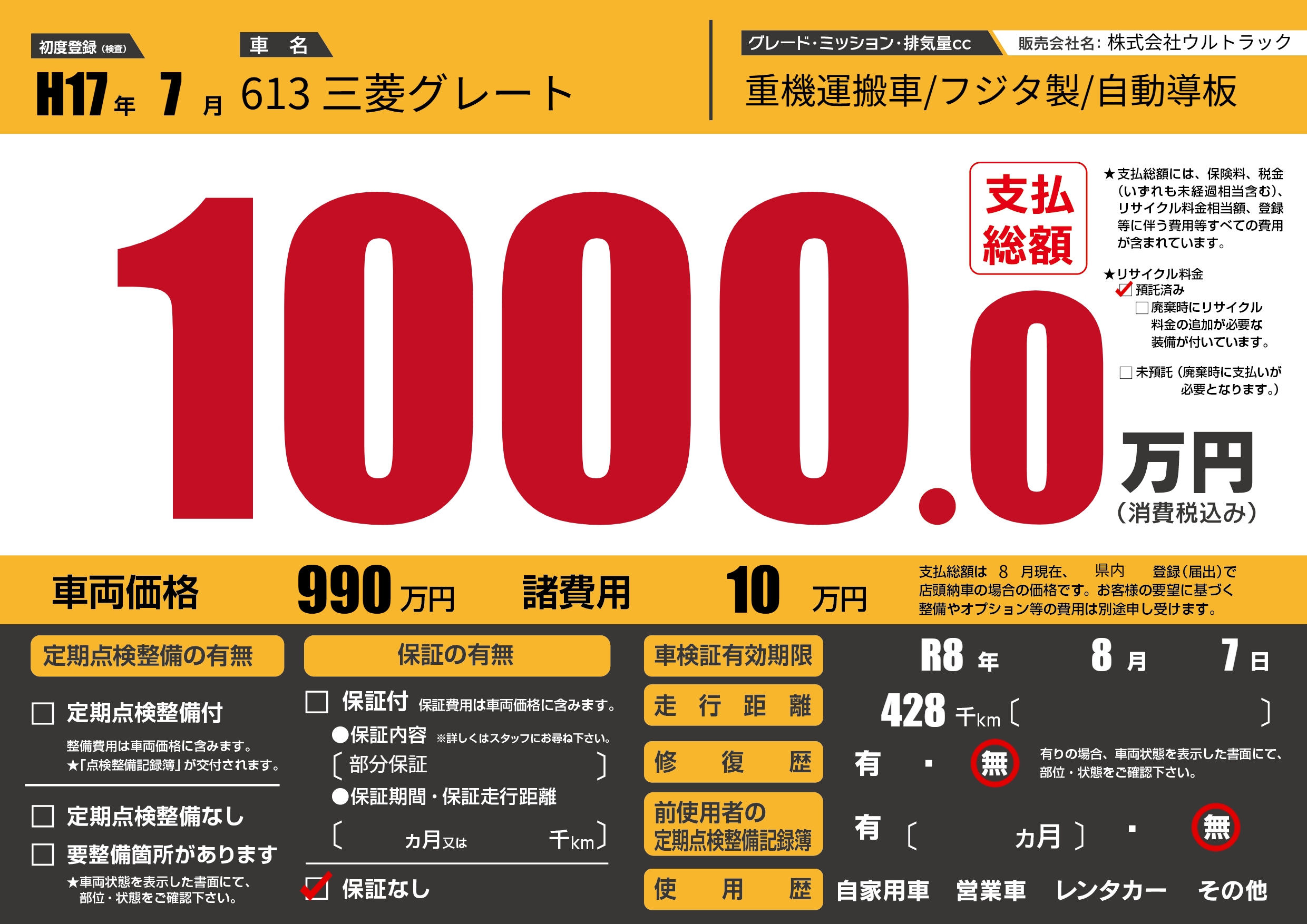 | 走行キロ | 42.8万km | 初年度登録 | H17年7月 |