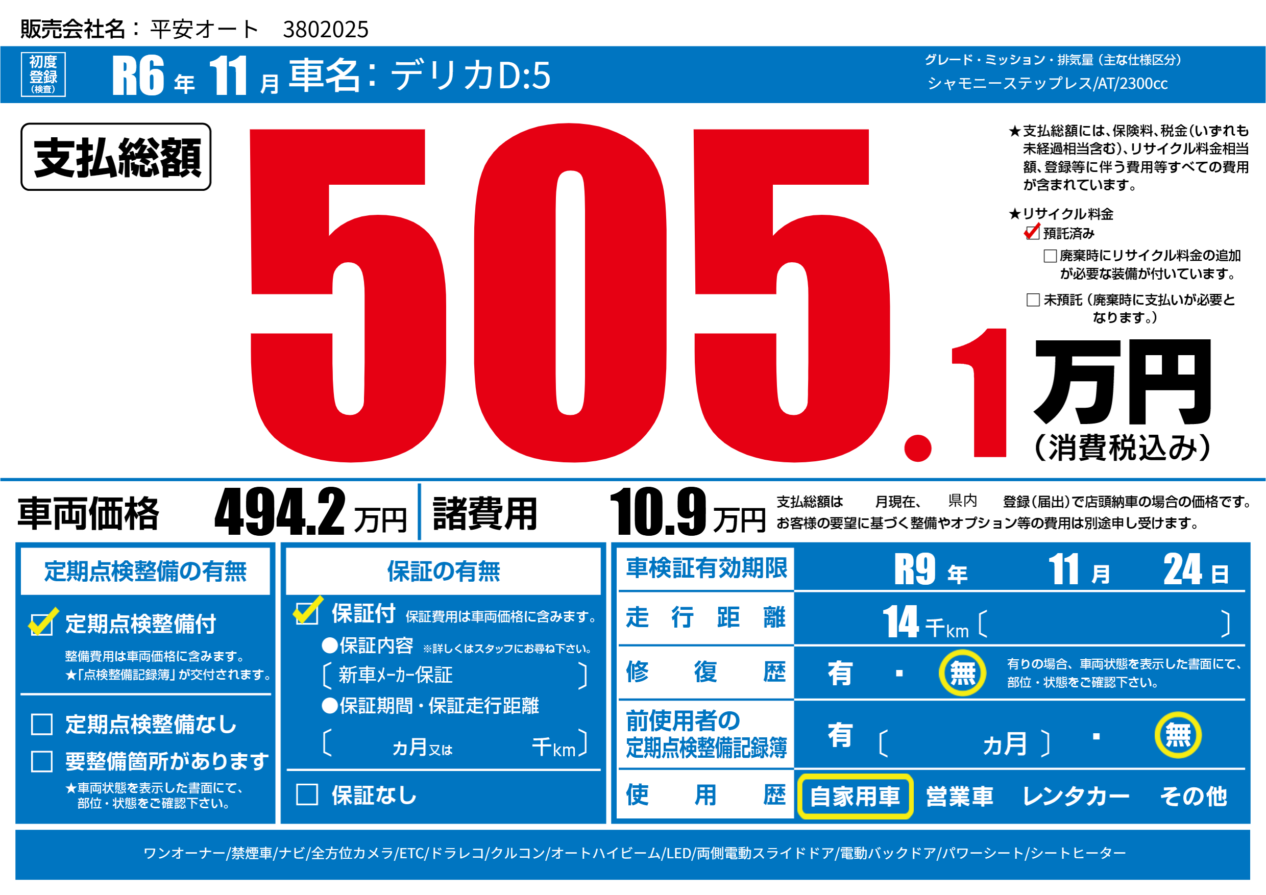 | 車名 | デリカD:5 | グレード ミッション 排気量 |
