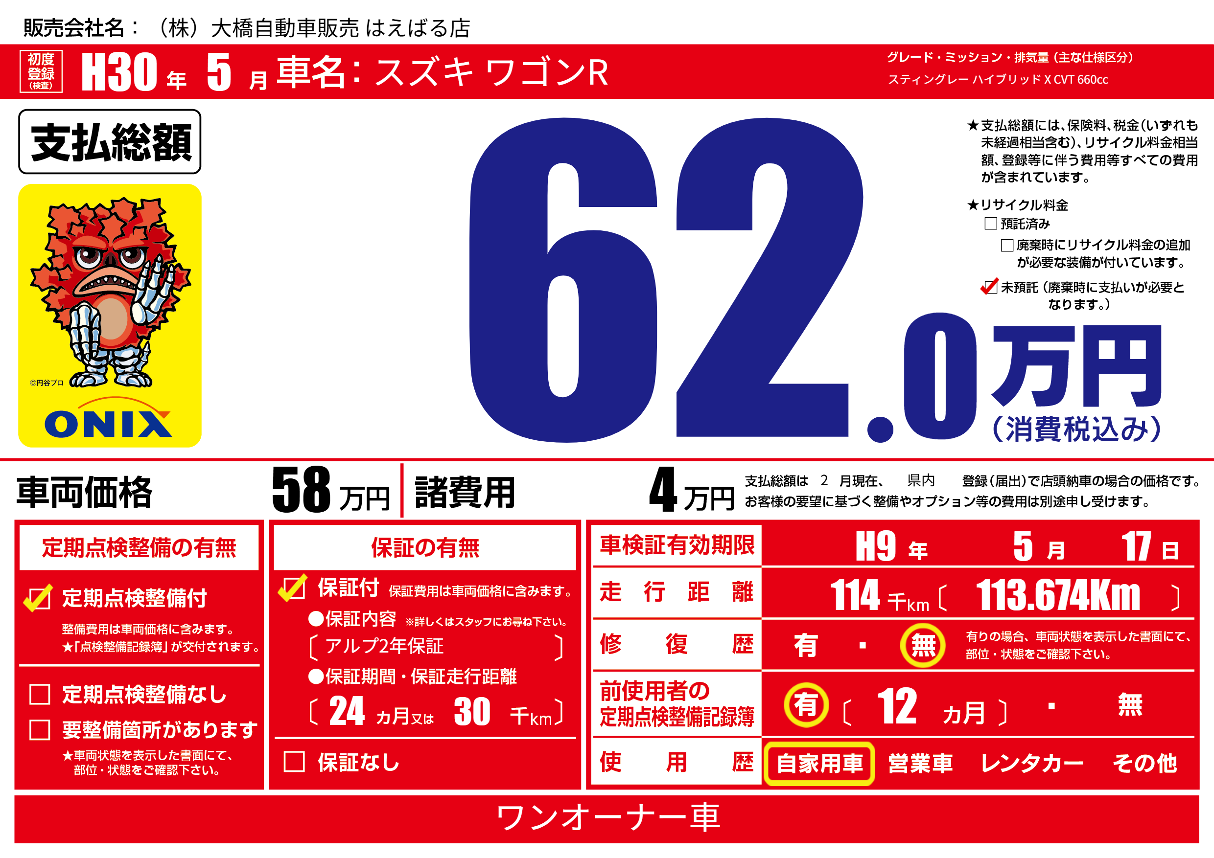 保証付き 保証内容(アルプ2年保証) 24ヶ月または(30)千kmまで |