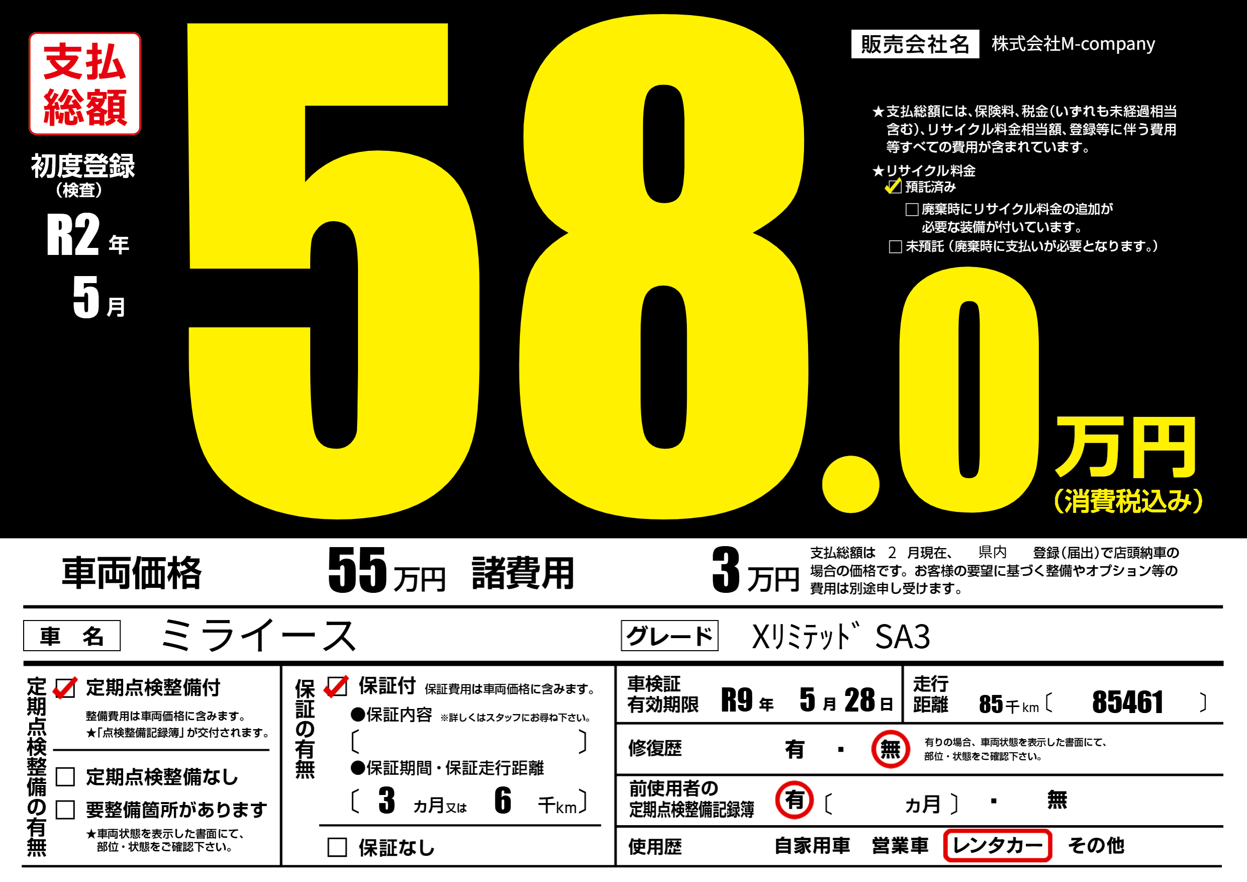 | 走行キロ | 8.5万km | 初年度登録 | R2年5月 |