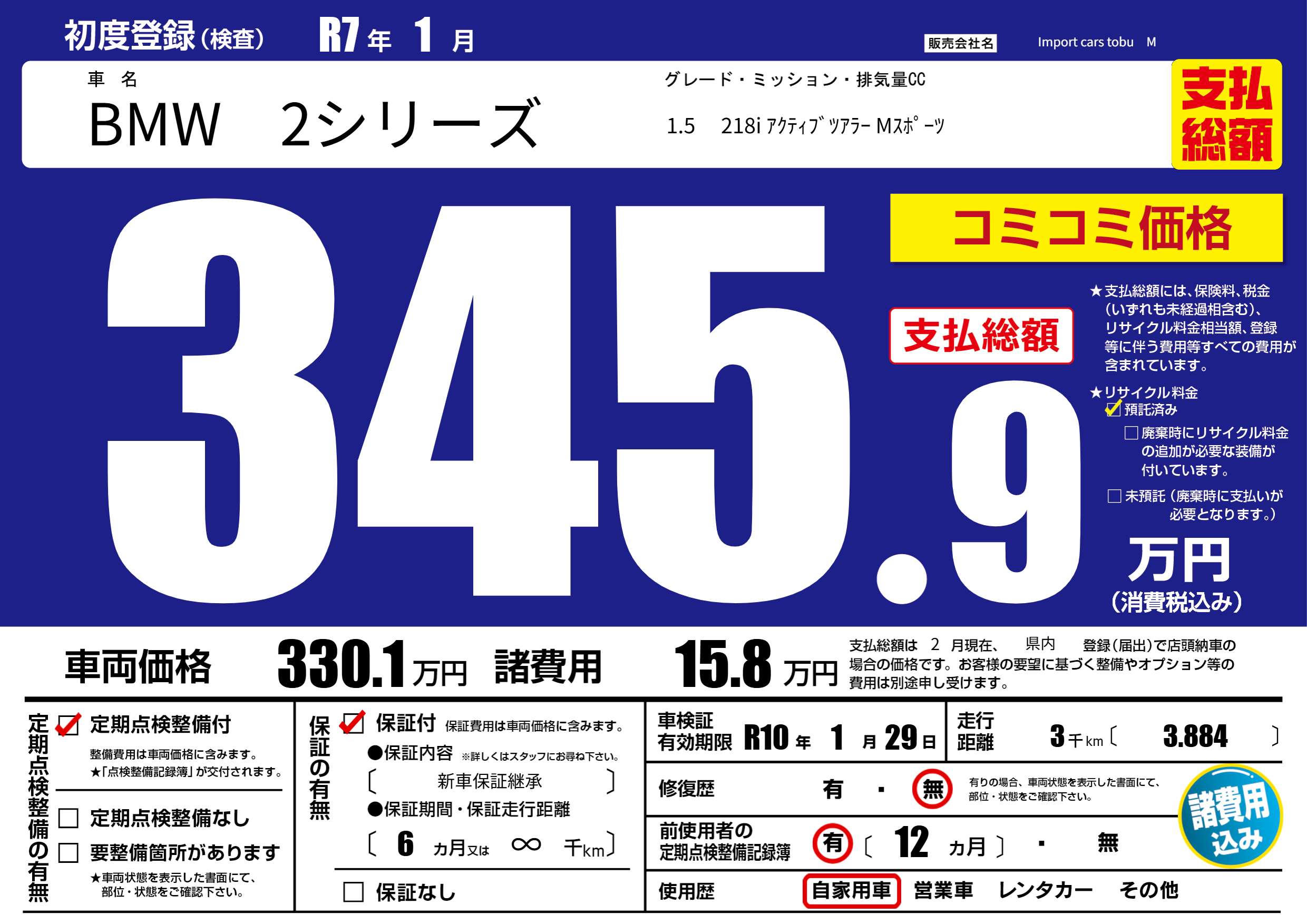| 車検制限 | R10年 1月 29日 | ||