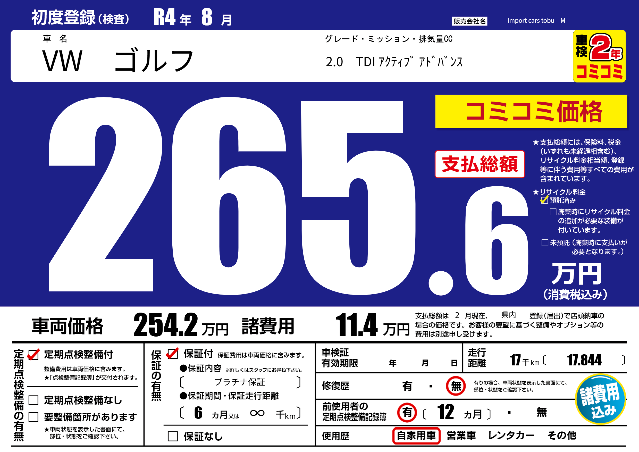 | 車名 | VW ゴルフ | グレード ミッション 排気量 |