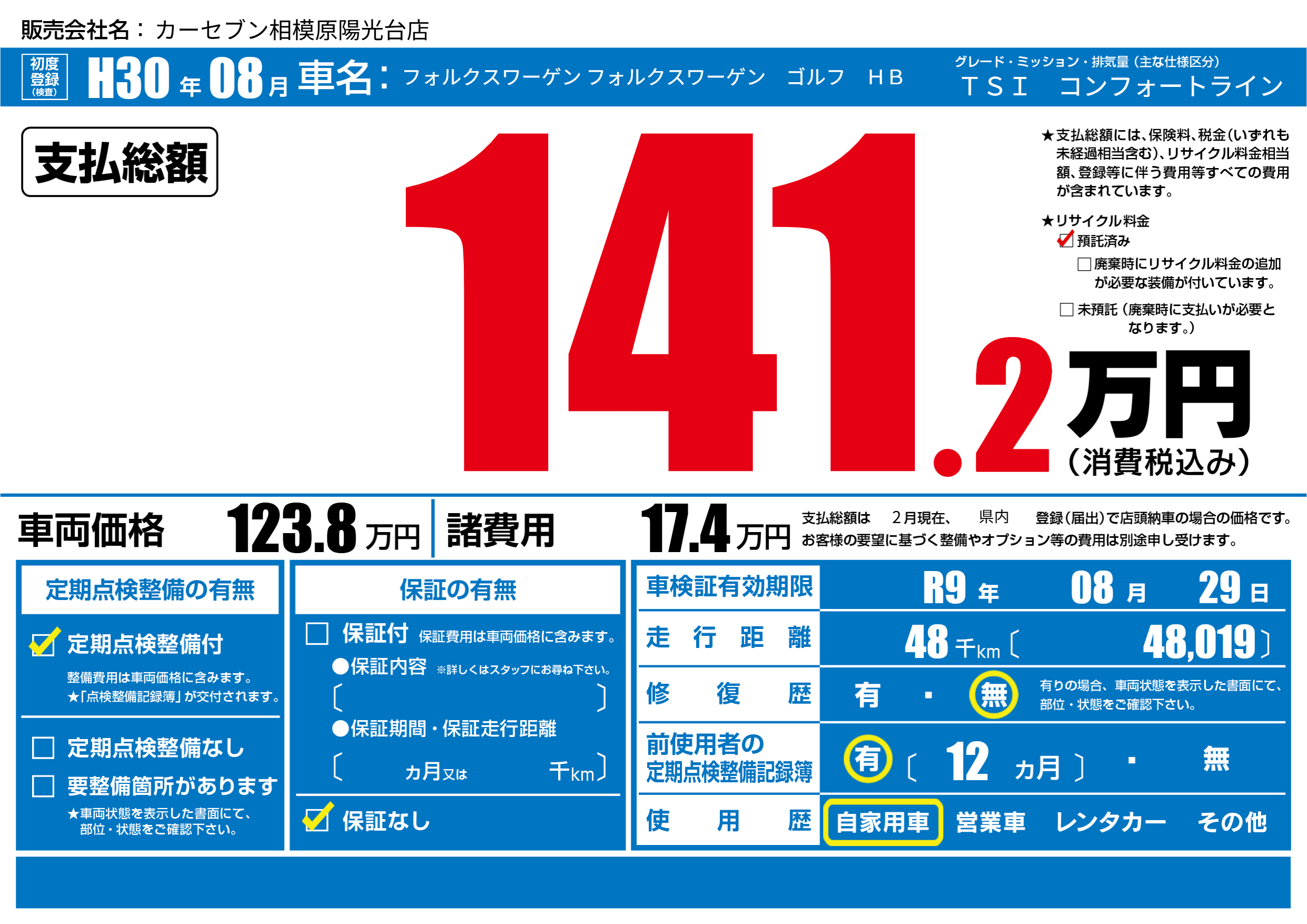 | 車名 | フォルクスワーゲン フォルクスワーゲン ゴルフ HB | グレード ミッション 排気量 |