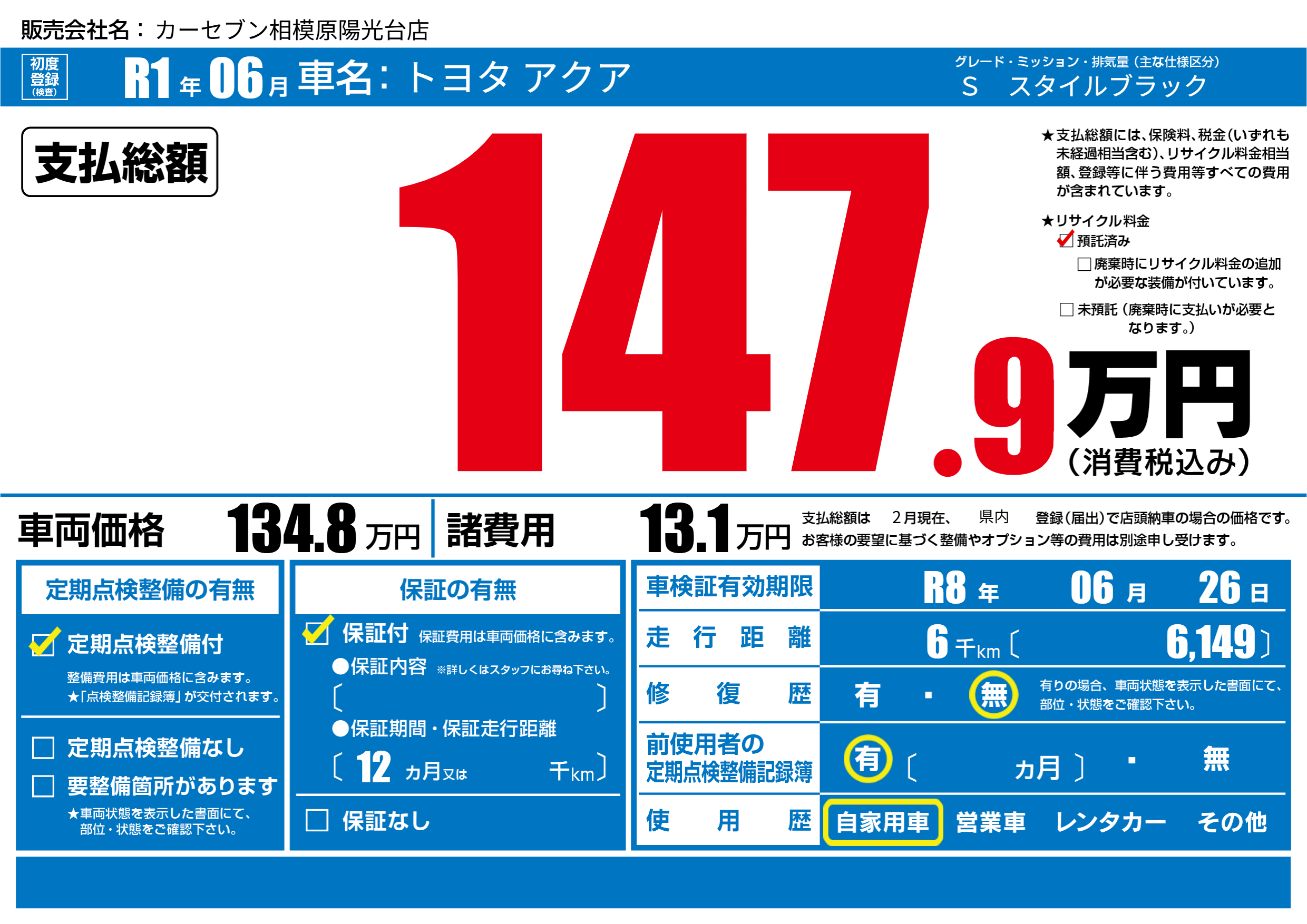 | 車名 | トヨタ アクア | グレード ミッション 排気量 |