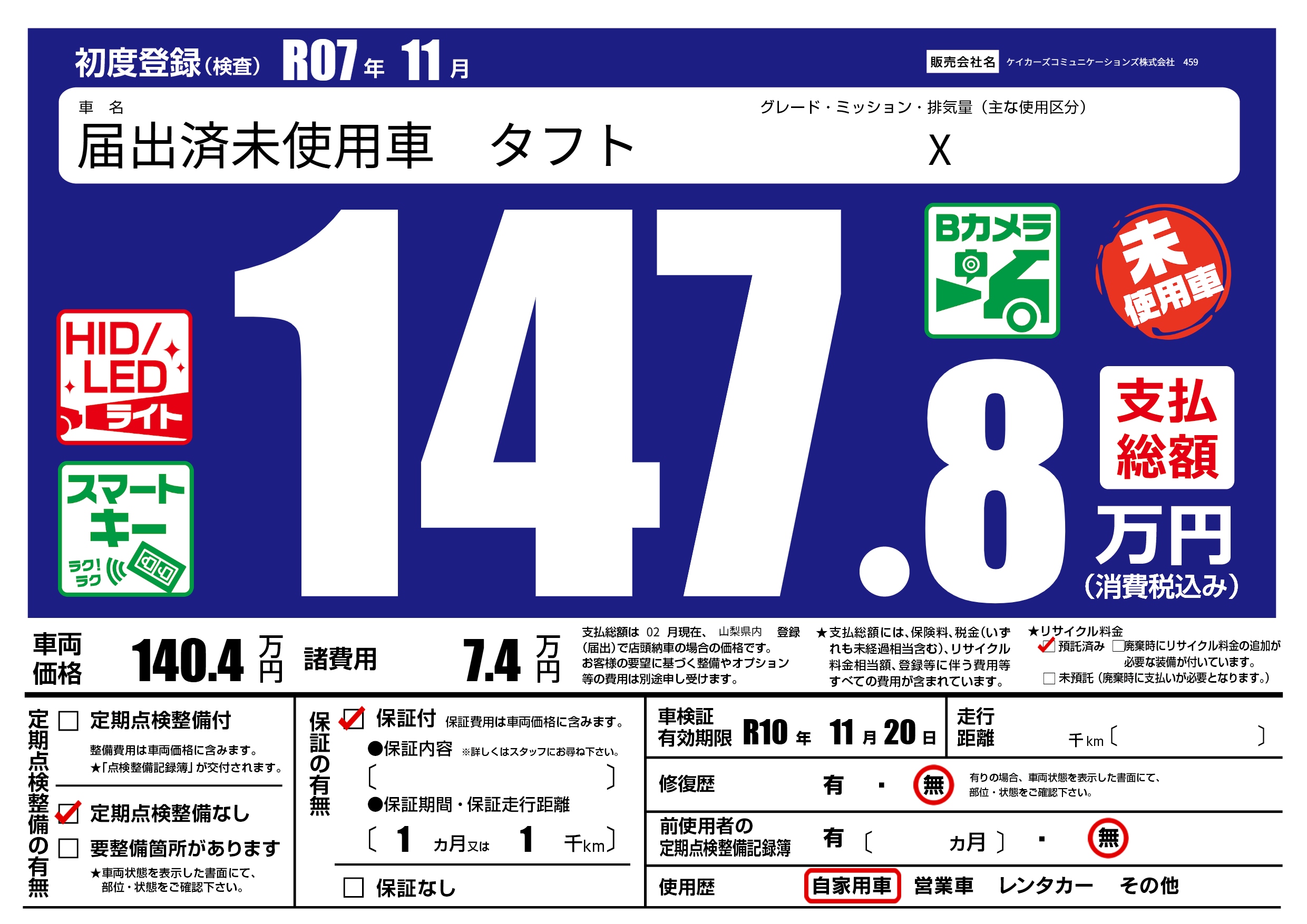 | 走行キロ | - | 初年度登録 | R07年11月 |