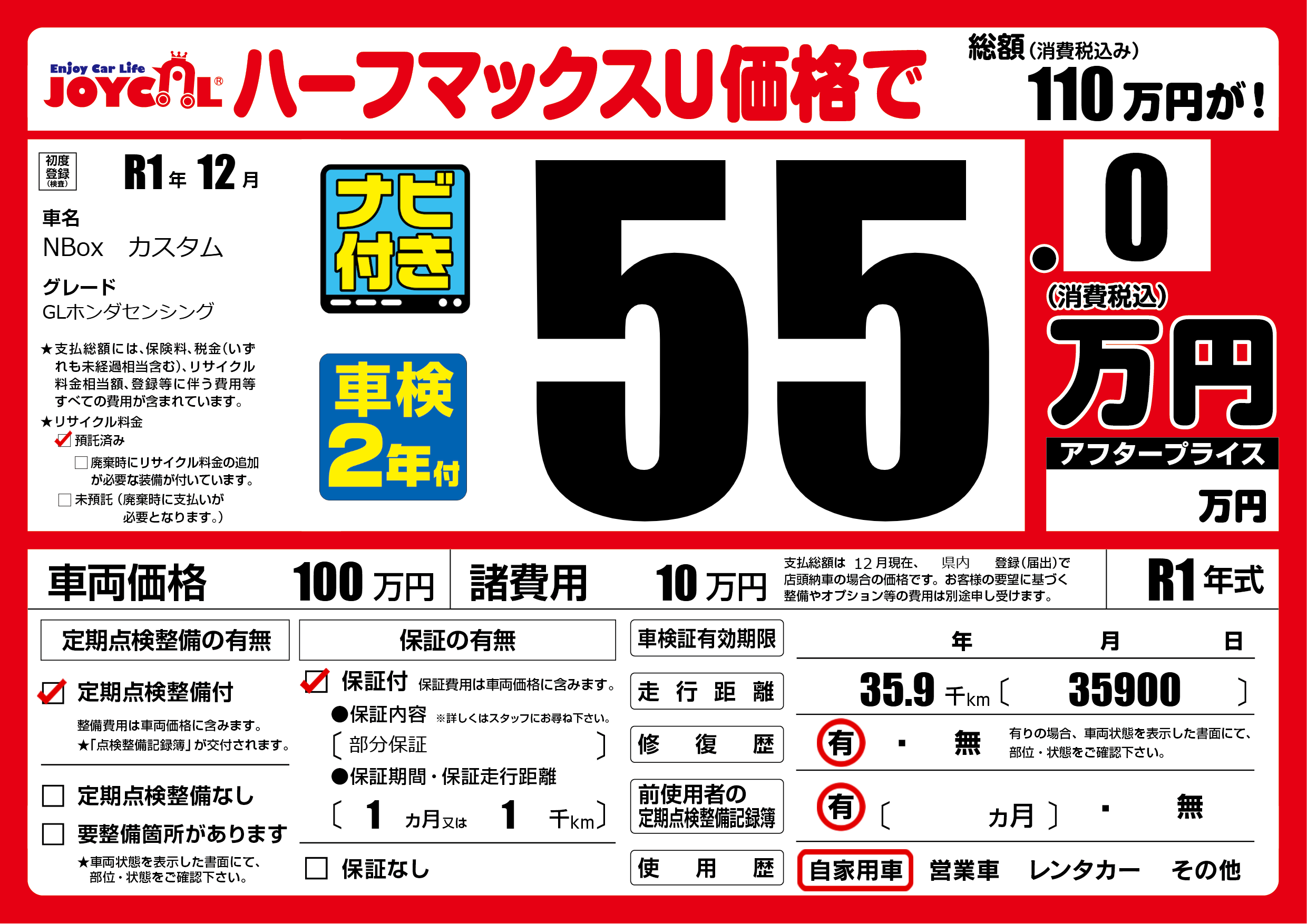 | 走行キロ | 3.5万km | 初年度登録 | R1年12月 |