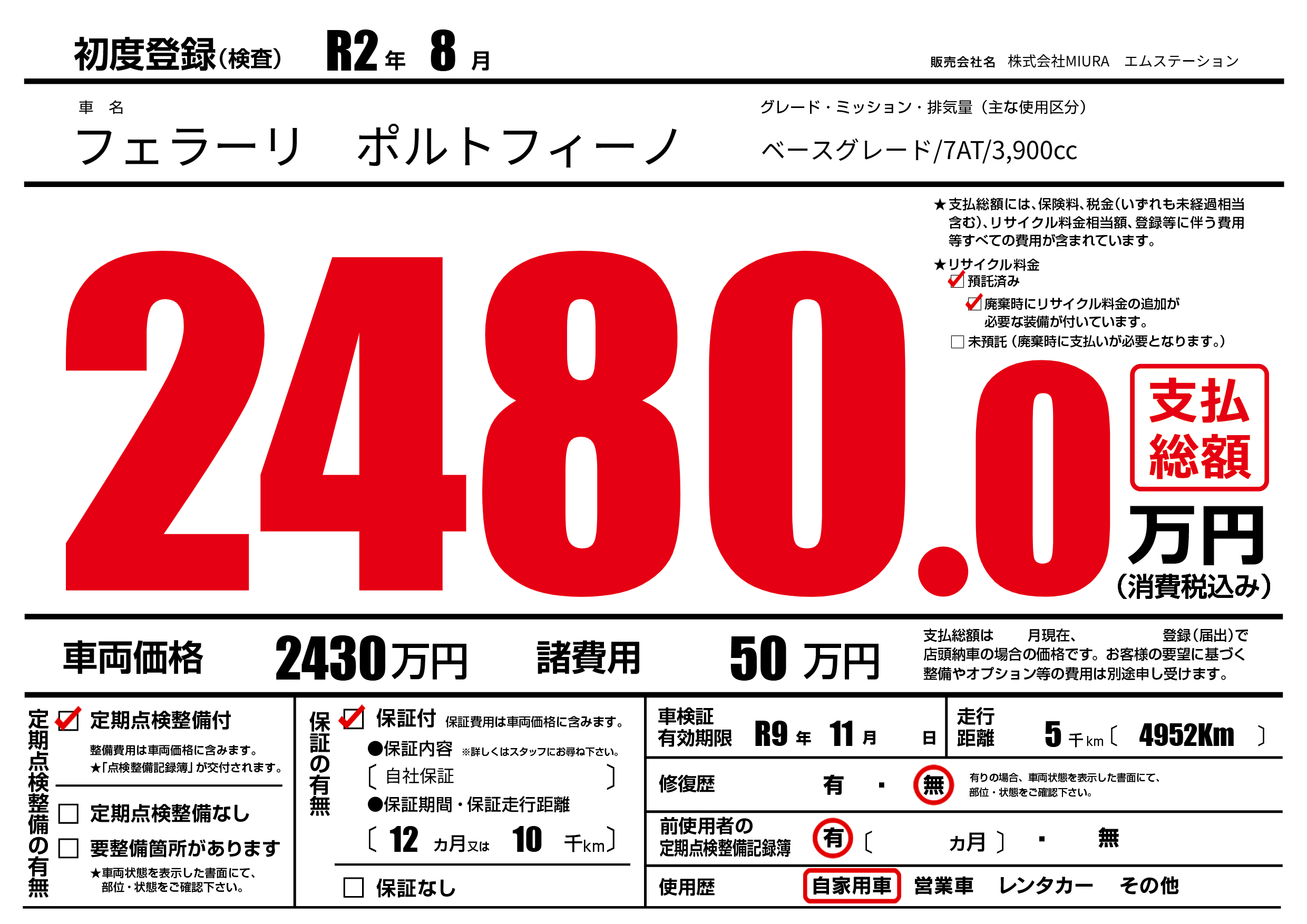 | 車名 | フェラーリ ポルトフィーノ | グレード ミッション 排気量 |