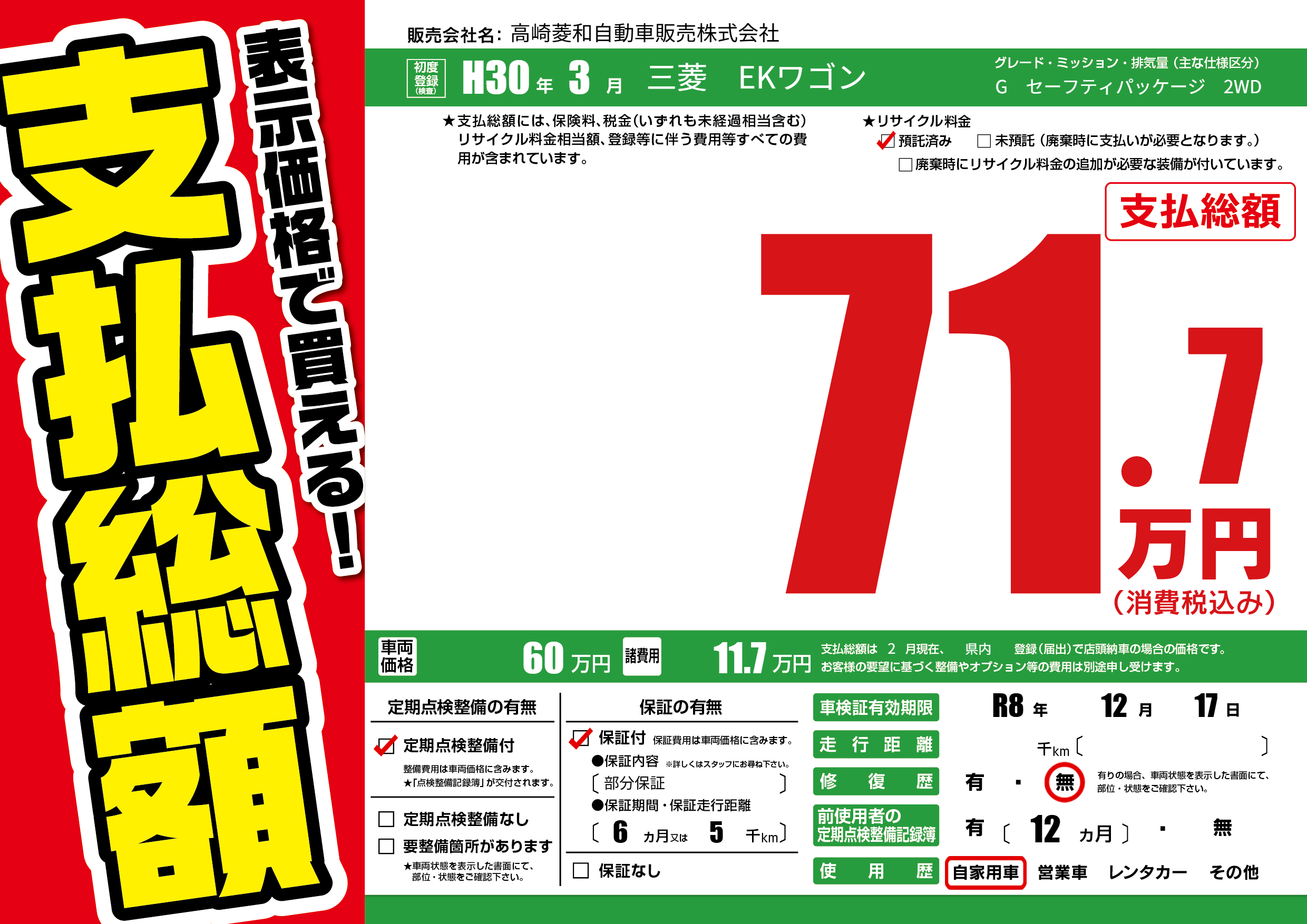 | 車名 | 三菱 EKワゴン | グレード ミッション 排気量 |