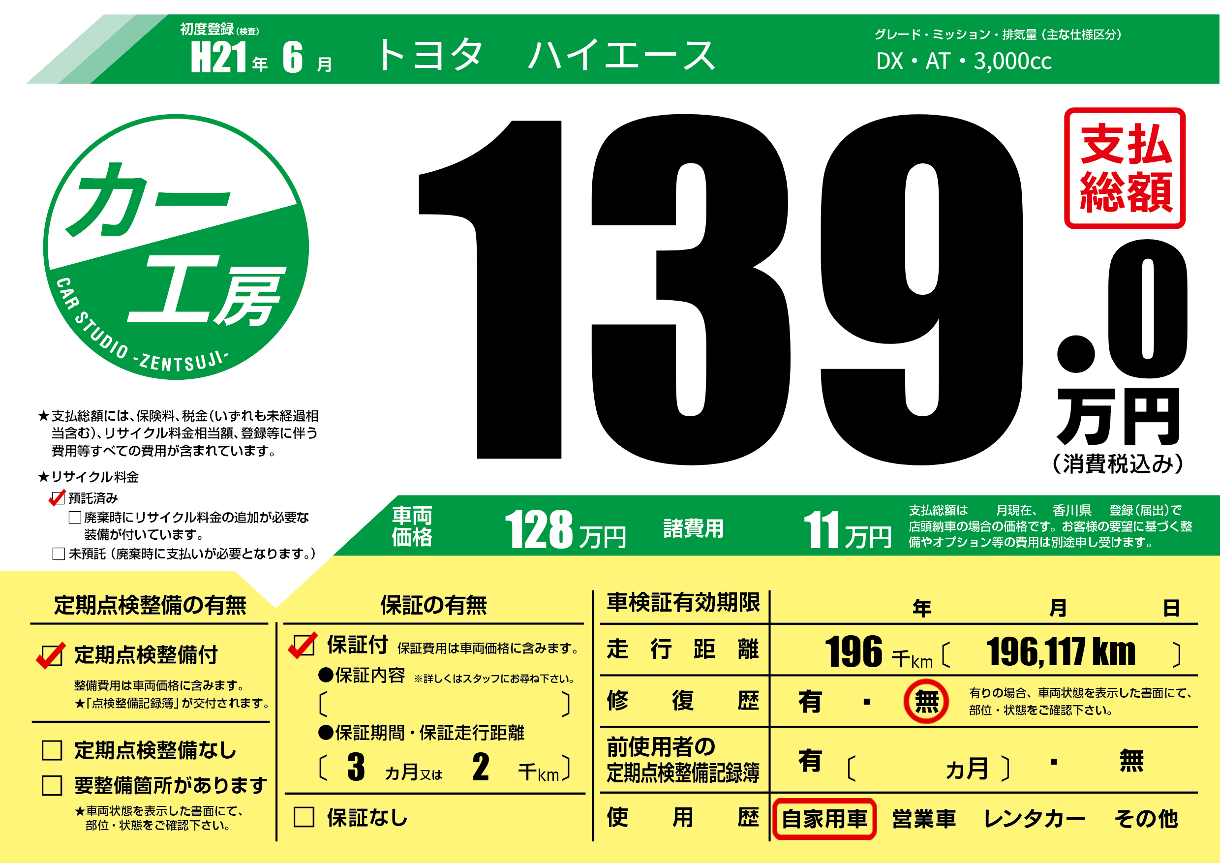 | 走行キロ | 19.6万km | 初年度登録 | H21年6月 |