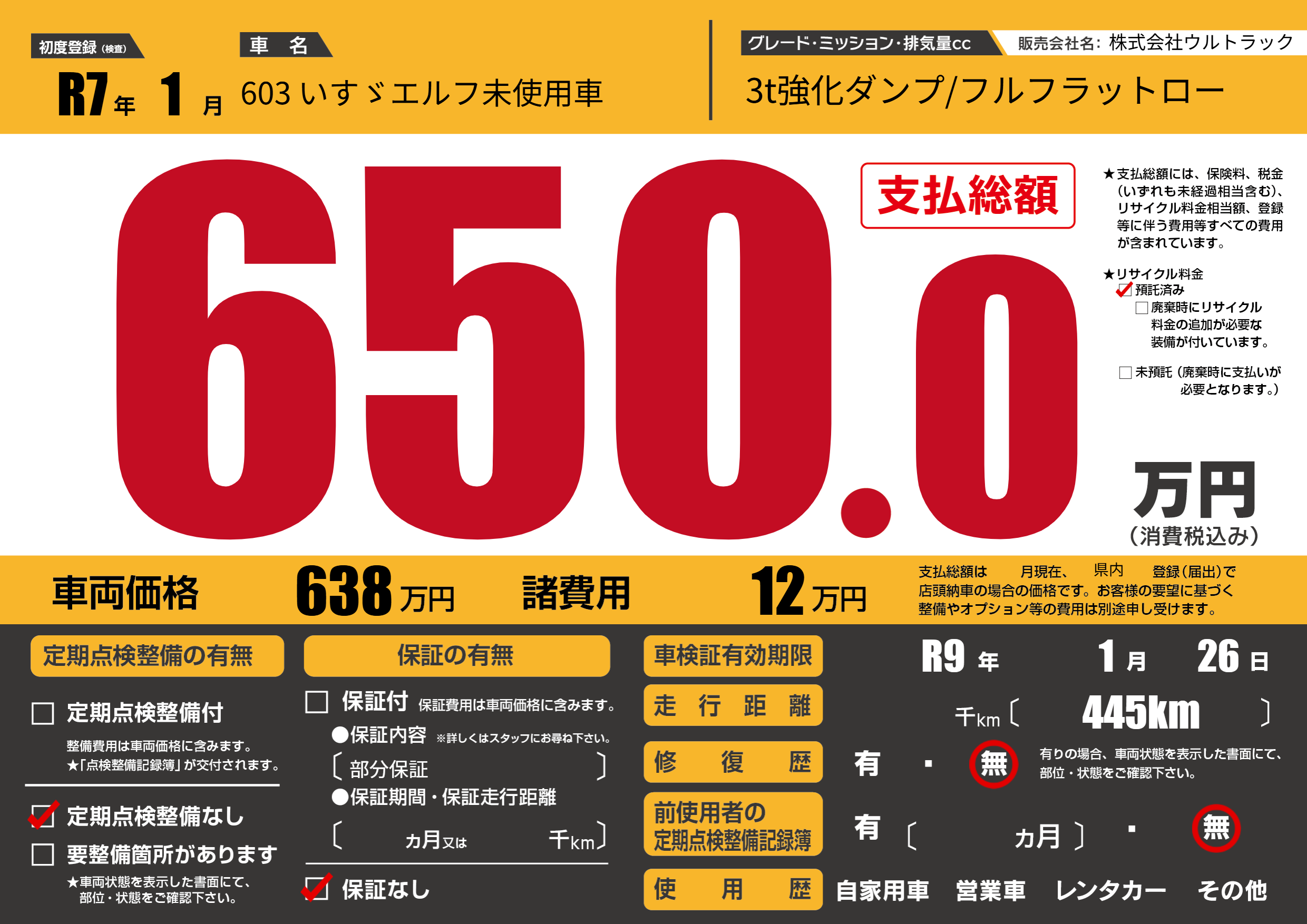 | 車名 | 603 いすゞエルフ未使用車 | グレード ミッション 排気量 |