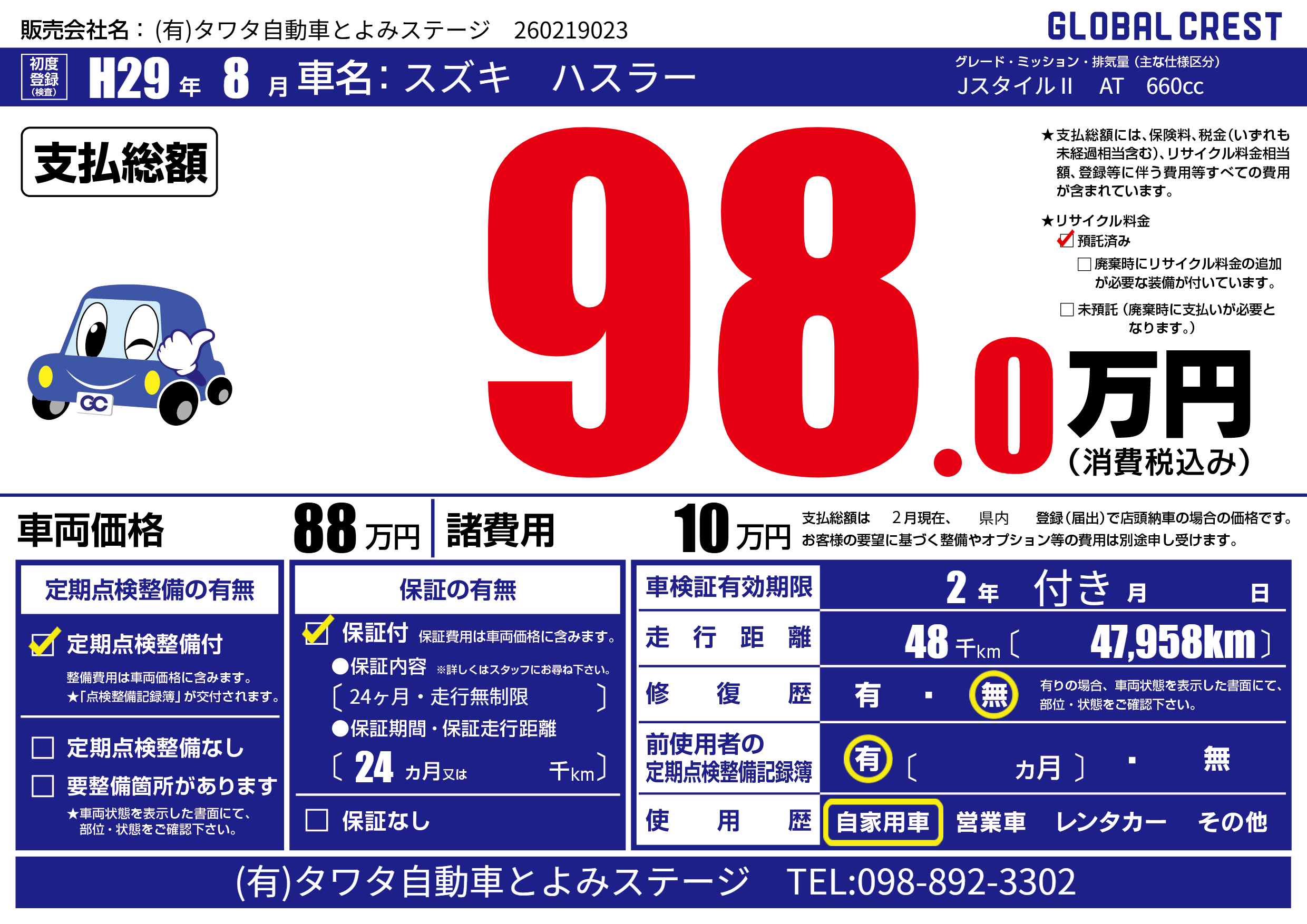 | 車名 | スズキ ハスラー | グレード ミッション 排気量 |