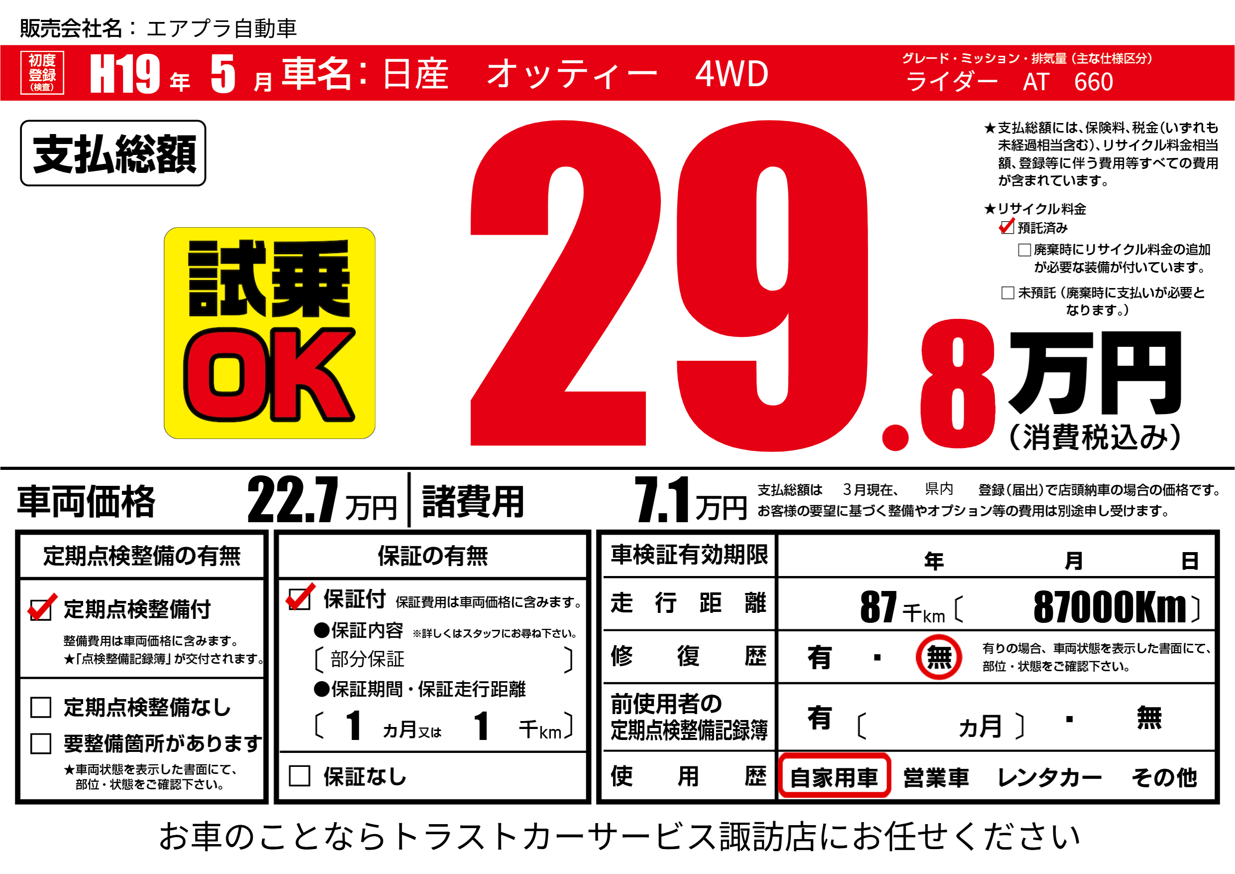 | 走行キロ | 8.7万km | 初年度登録 | H19年5月 |