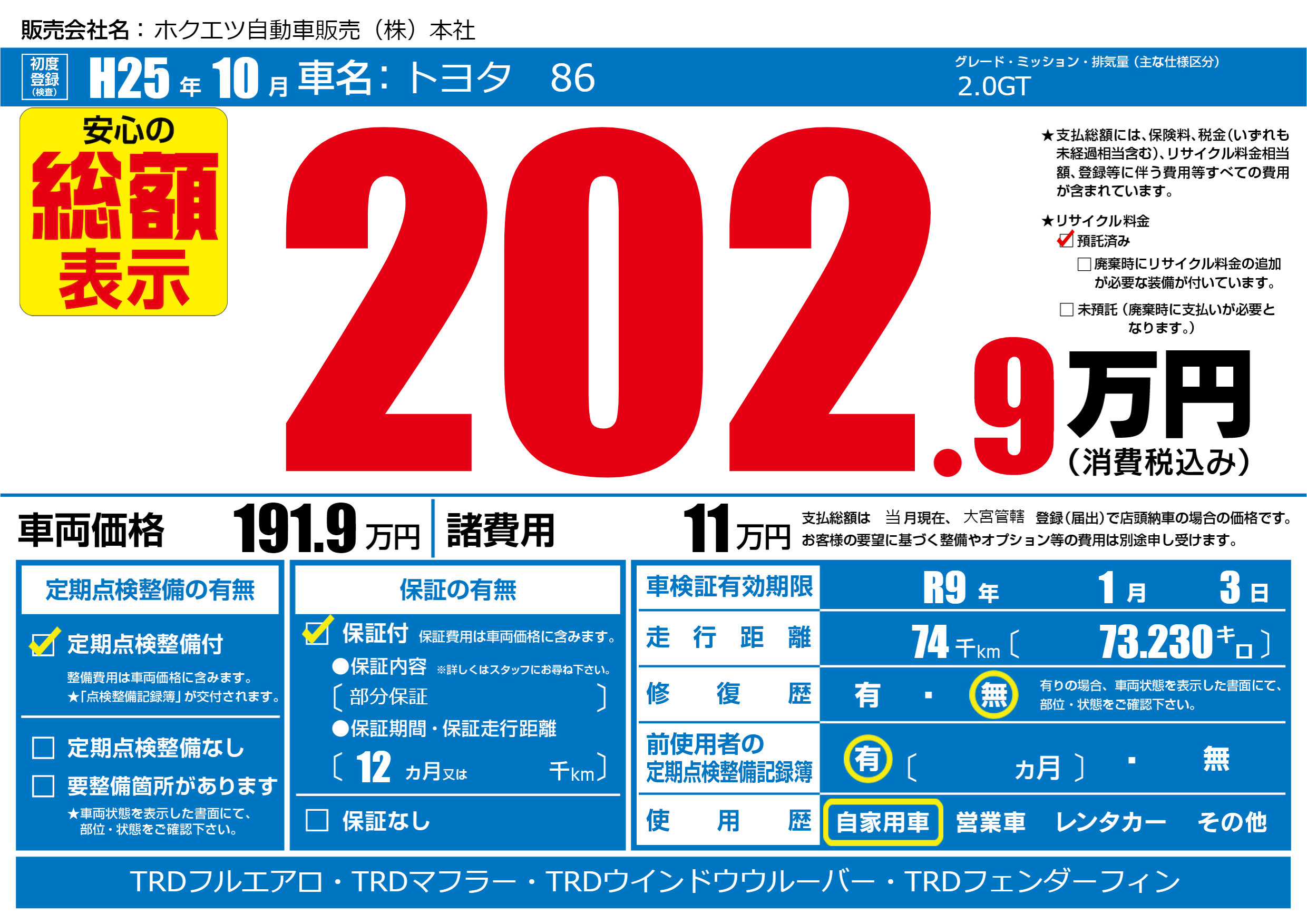 | 車名 | トヨタ 86 | グレード ミッション 排気量 |