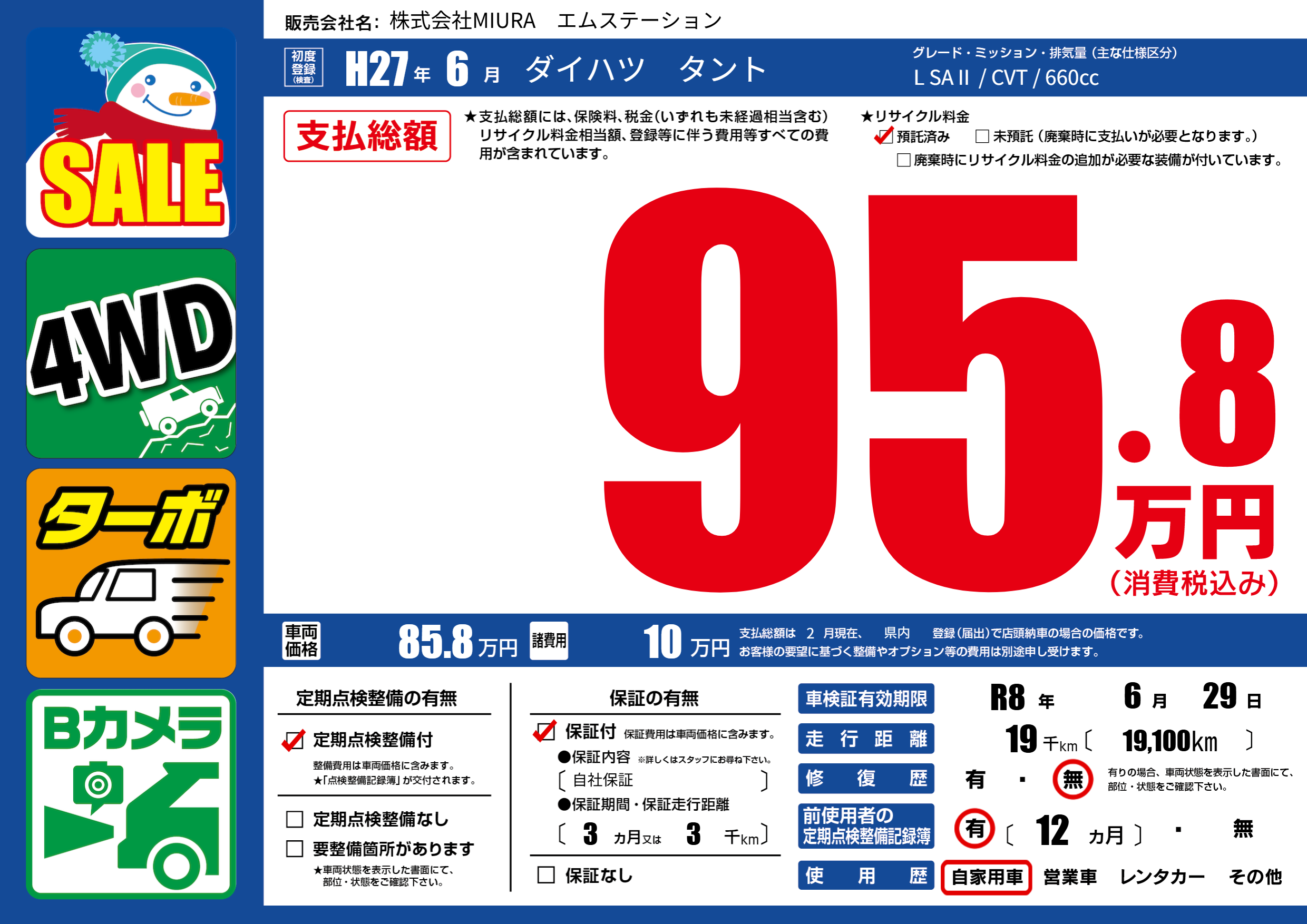 | 車名 | ダイハツ タント | グレード ミッション 排気量 |