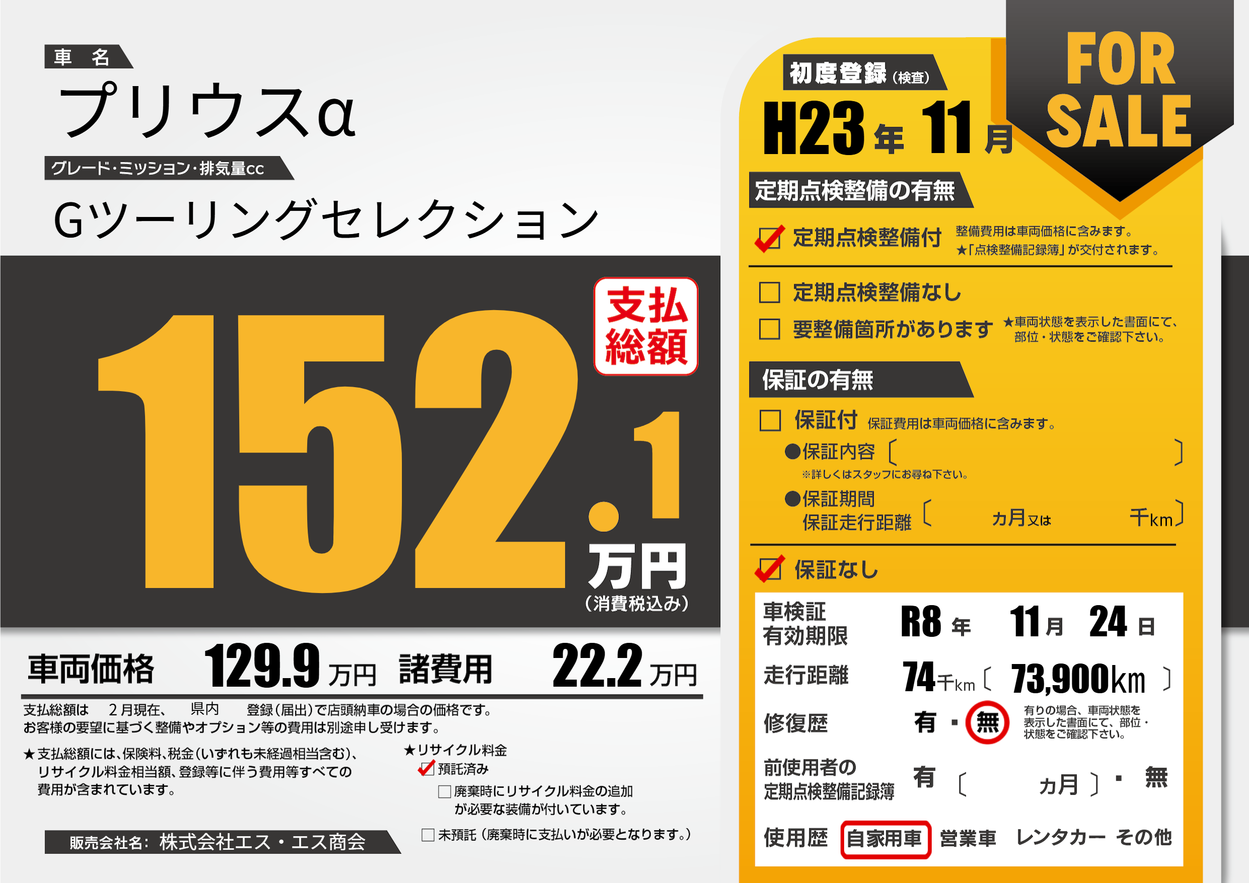 | 走行キロ | 7.4万km | 初年度登録 | H23年11月 |