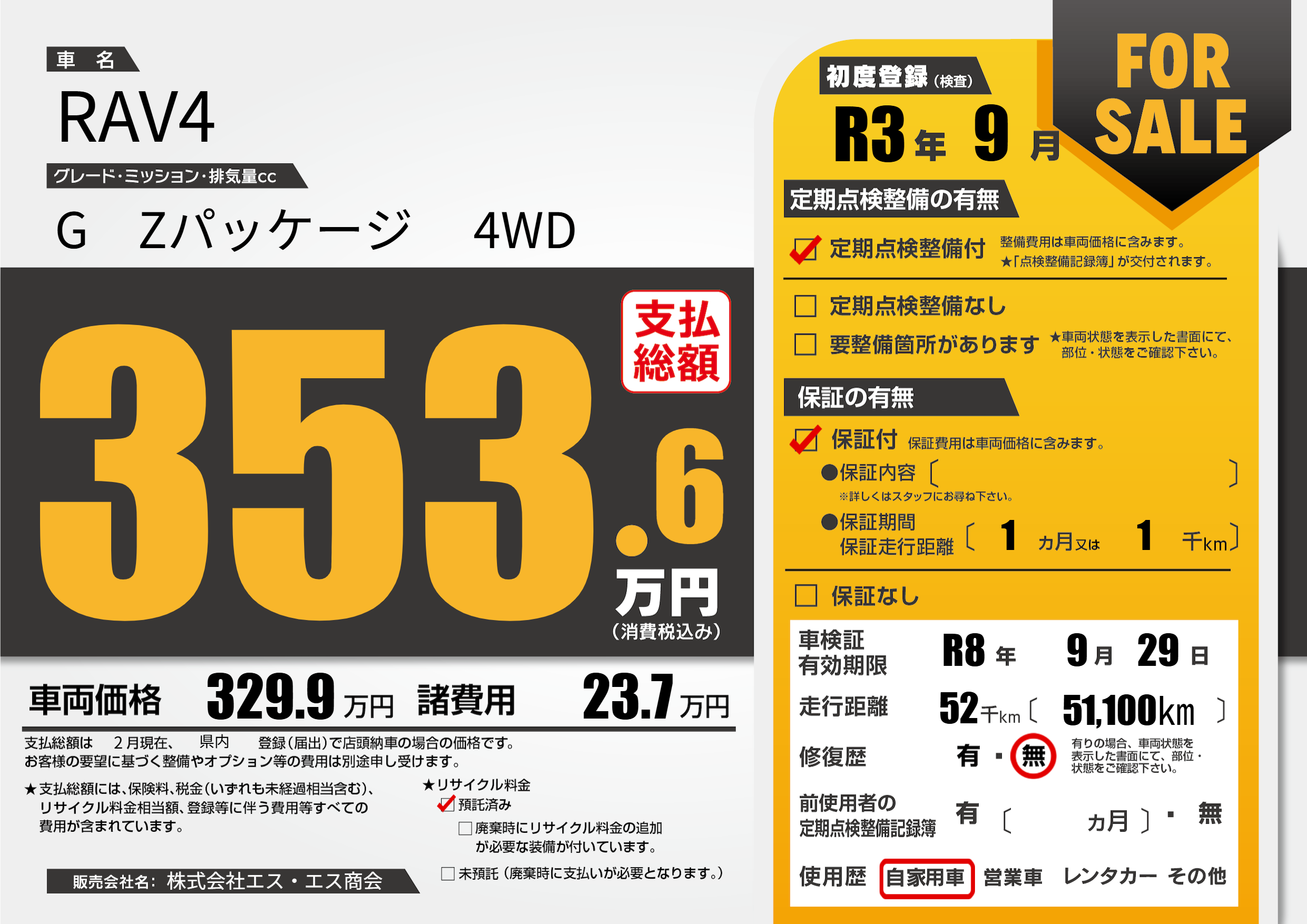 | 走行キロ | 5.2万km | 初年度登録 | R3年9月 |