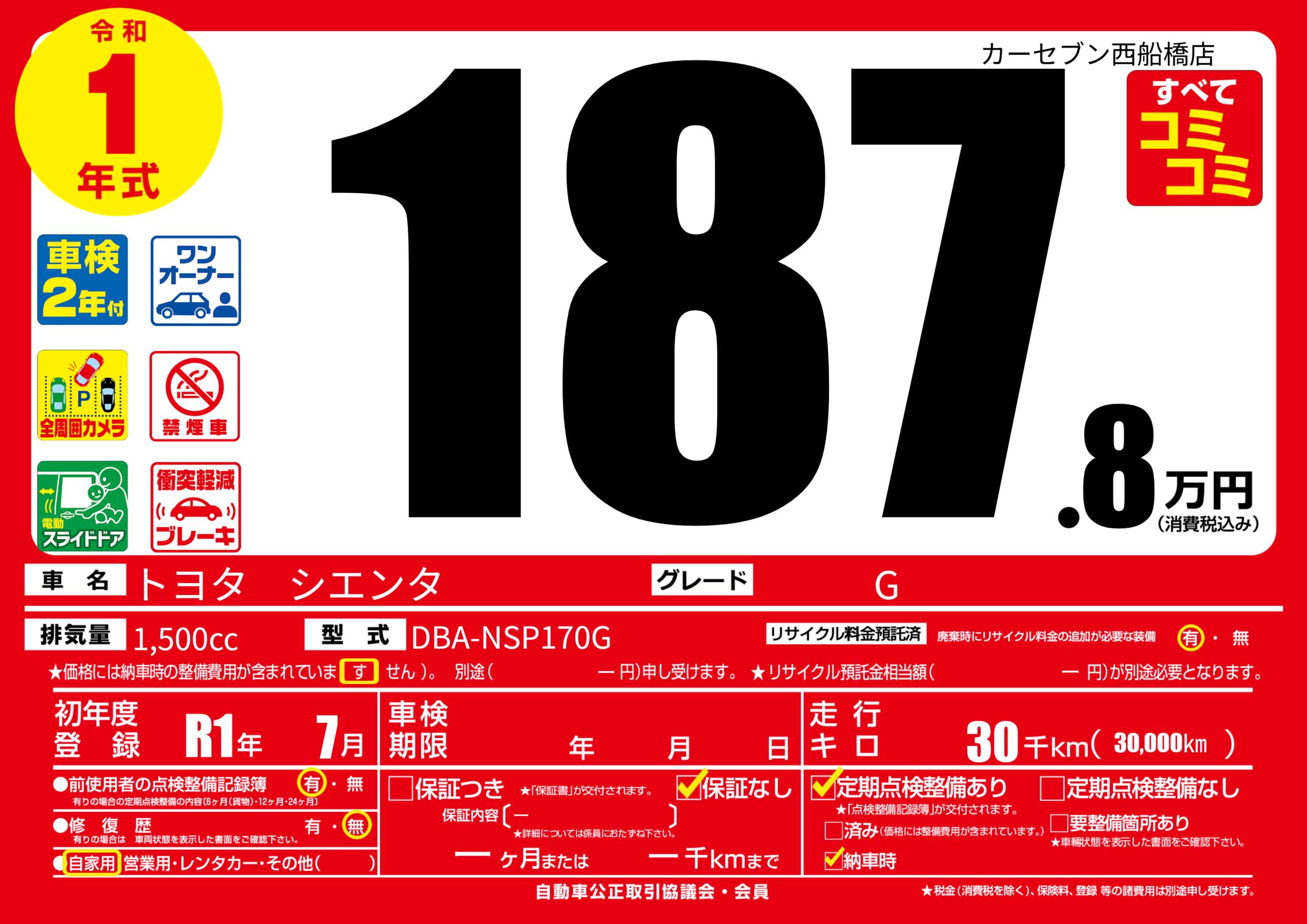 | 車名 | トヨタ シエンタ | グレード ミッション 排気量 |