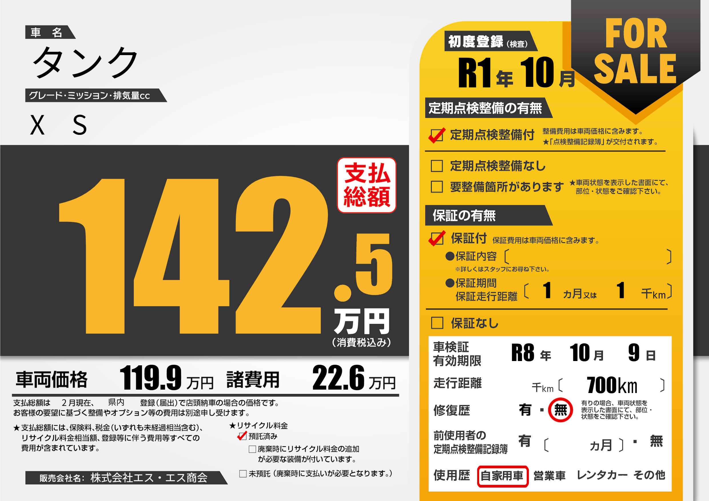 | 走行キロ | - | 初年度登録 | R1年10月 |
