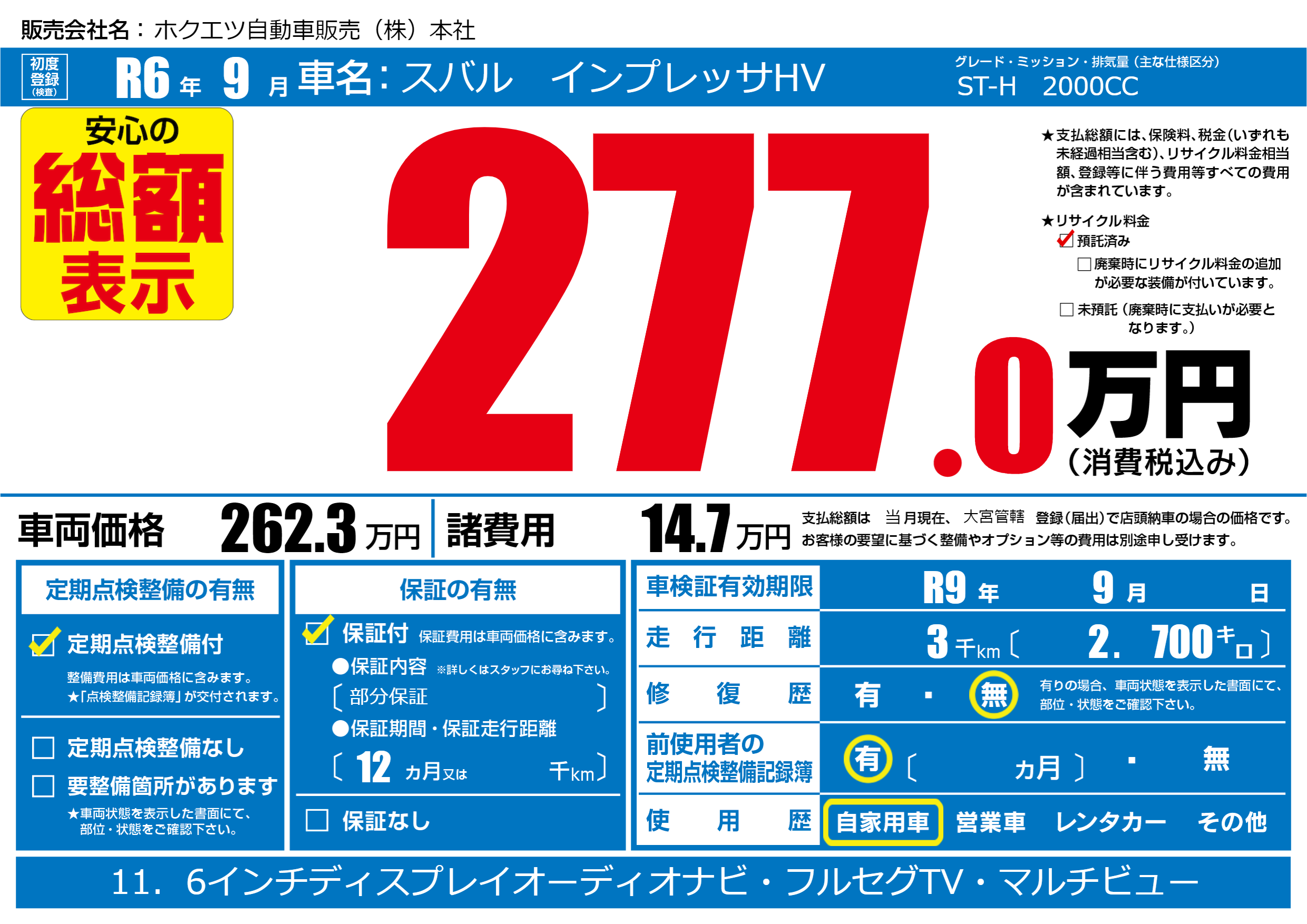| 車名 | スバル インプレッサHV | グレード ミッション 排気量 |