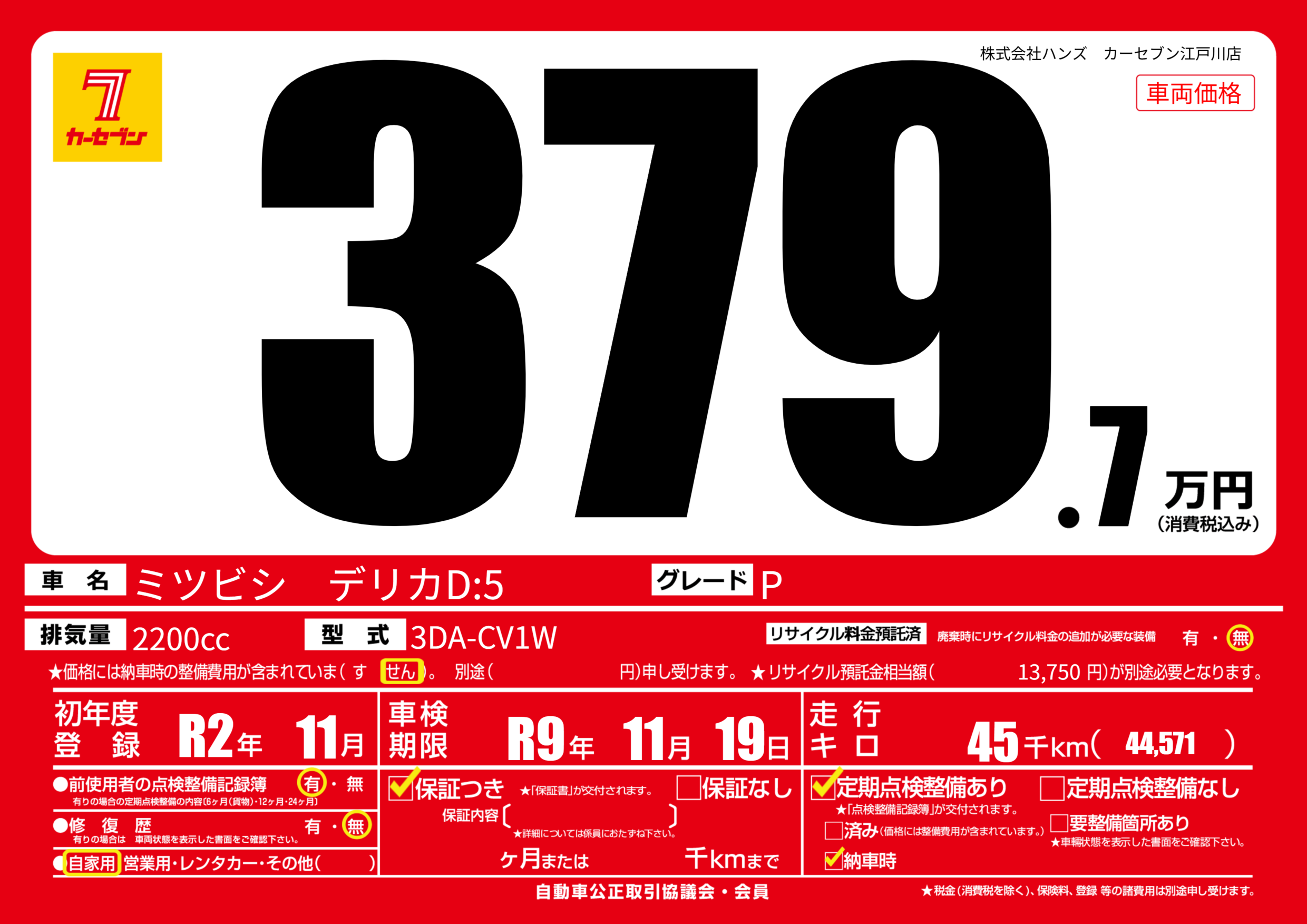 | 車名 | ミツビシ デリカD:5 | グレード ミッション 排気量 |