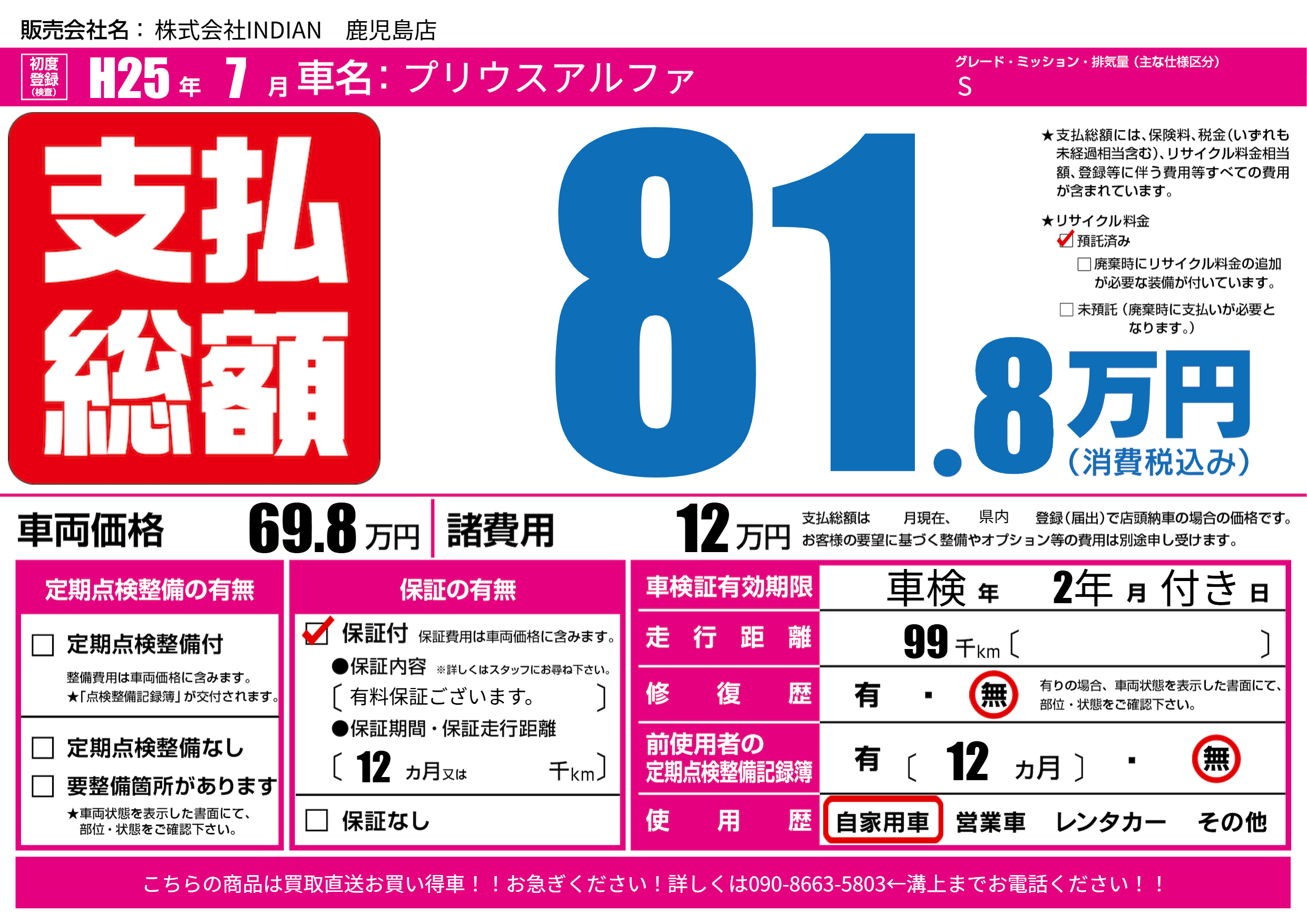| 走行キロ | 9.9万km | 初年度登録 | H25年7月 |