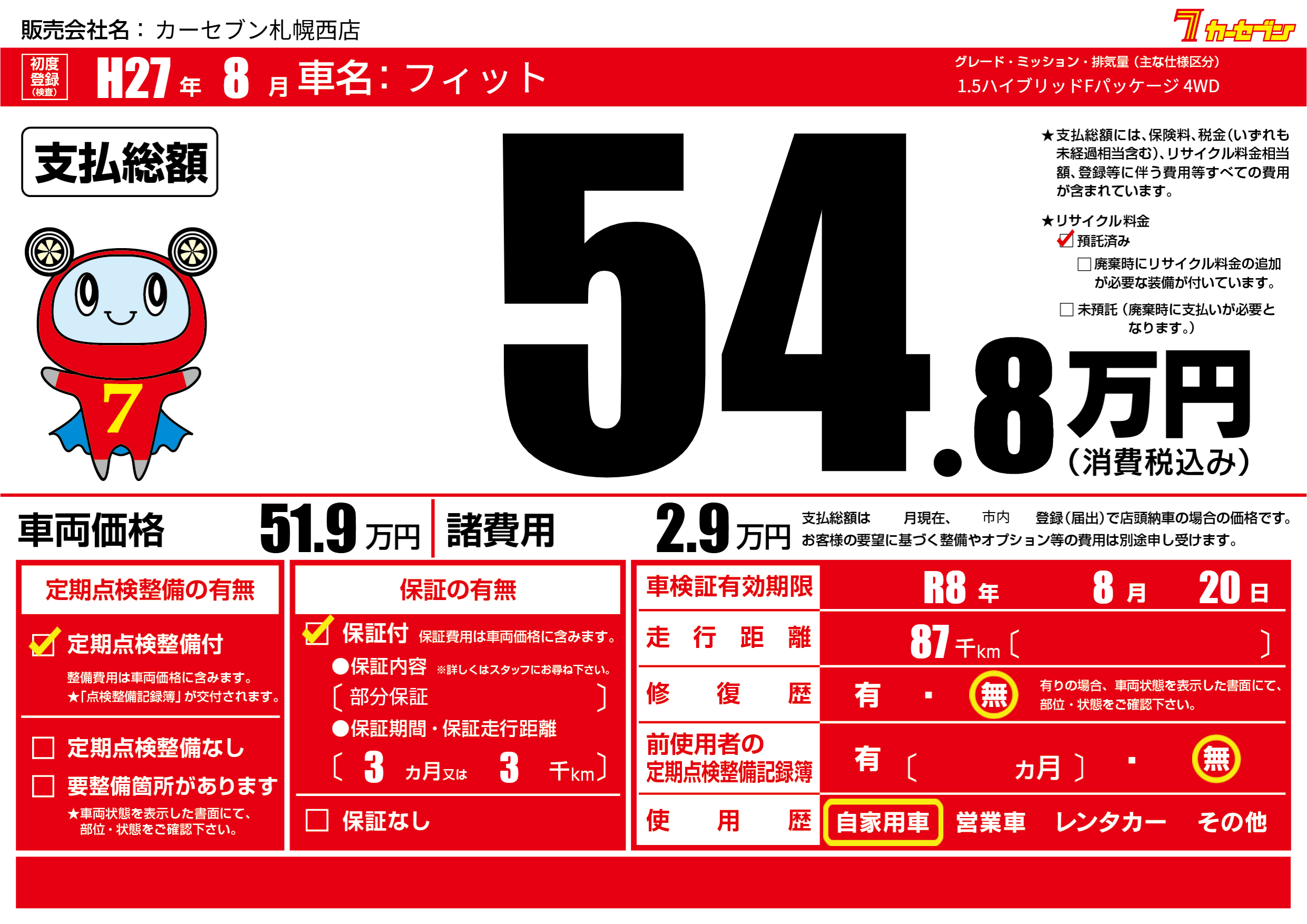 | 車検制限 | R8年 8月 20日 | ||
