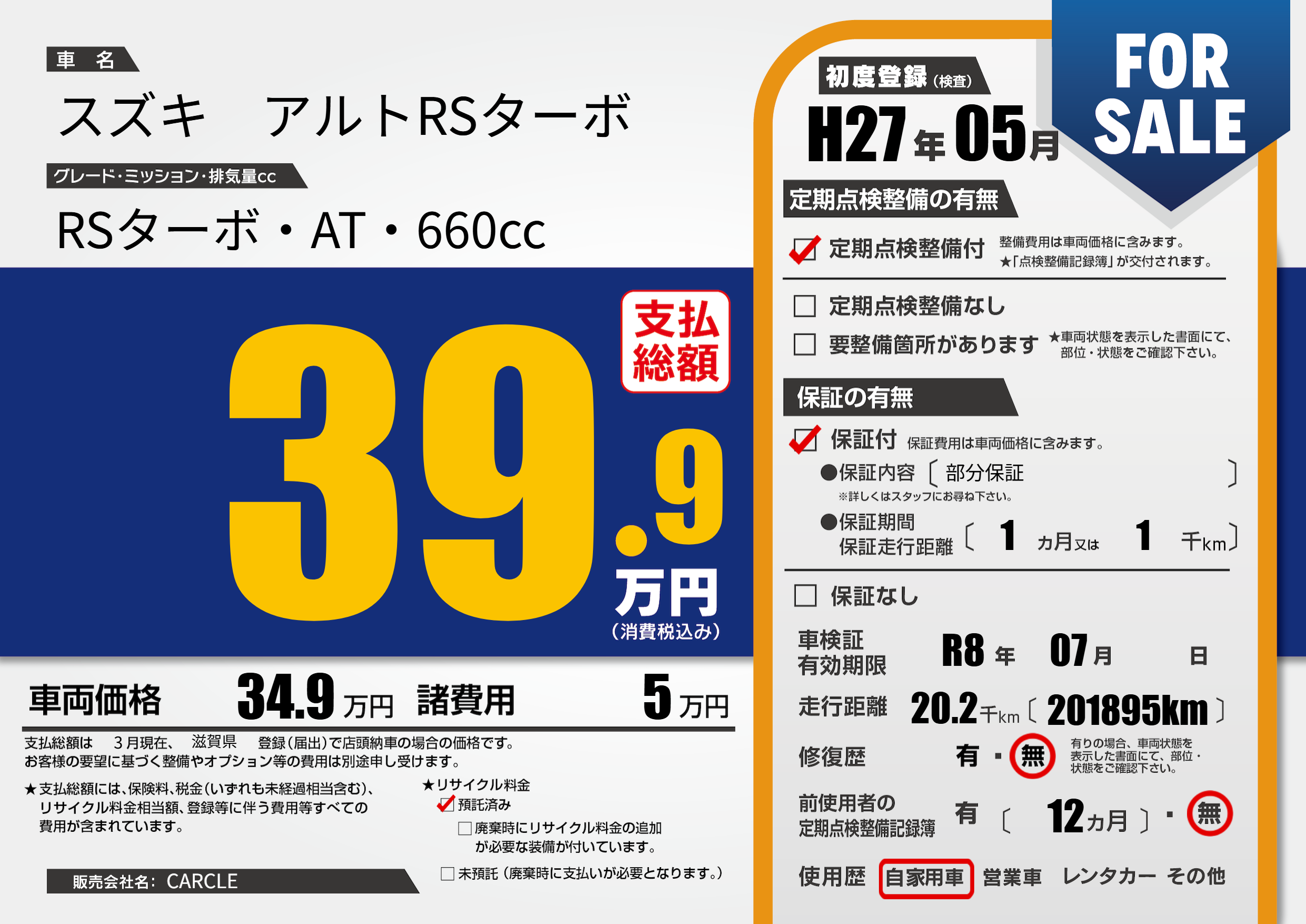 | 車名 | スズキ アルトRSターボ | グレード ミッション 排気量 |