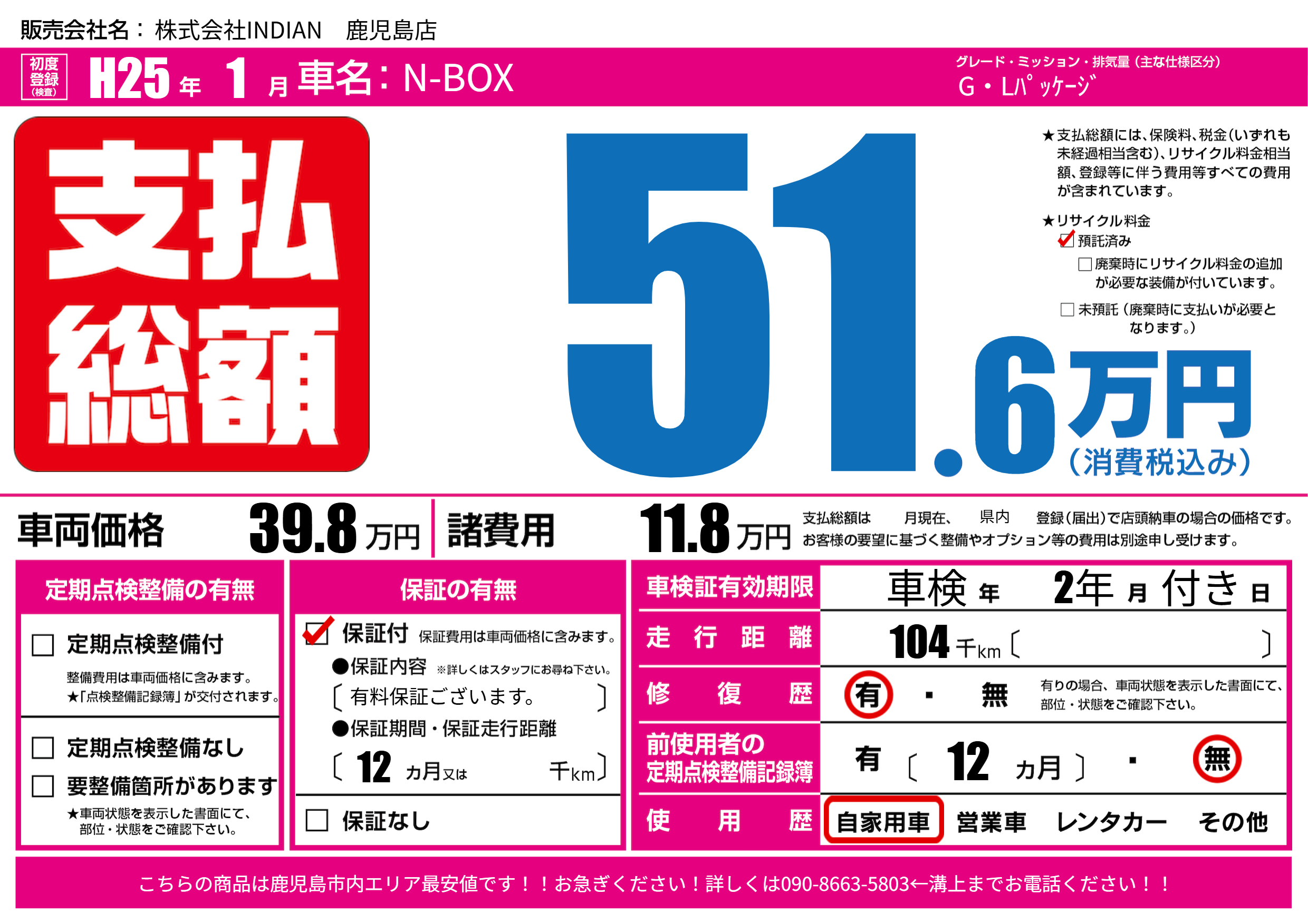 | 走行キロ | 10.4万km | 初年度登録 | H25年1月 |