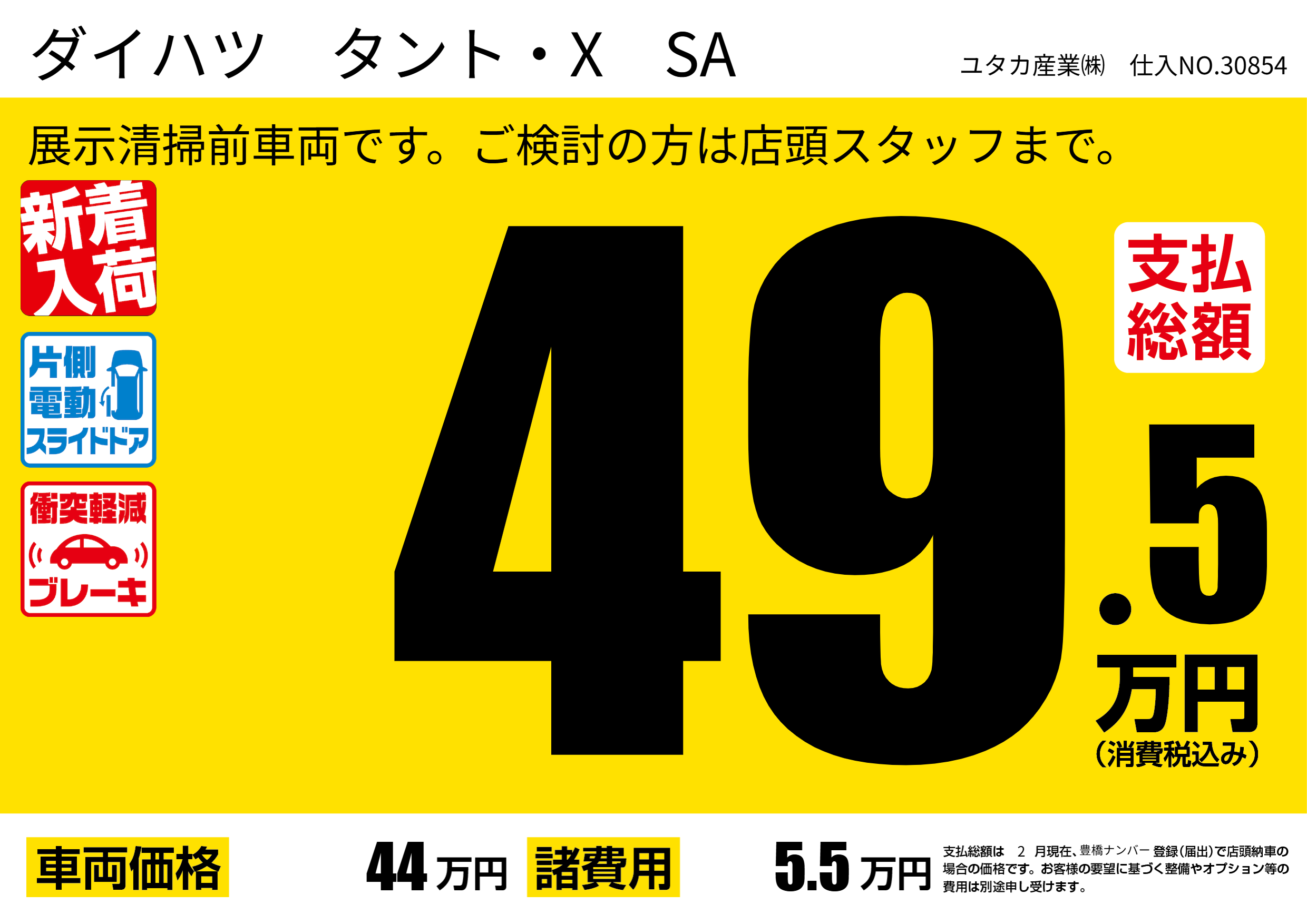 | 車名 | ダイハツ タント・X SA | グレード ミッション 排気量 |