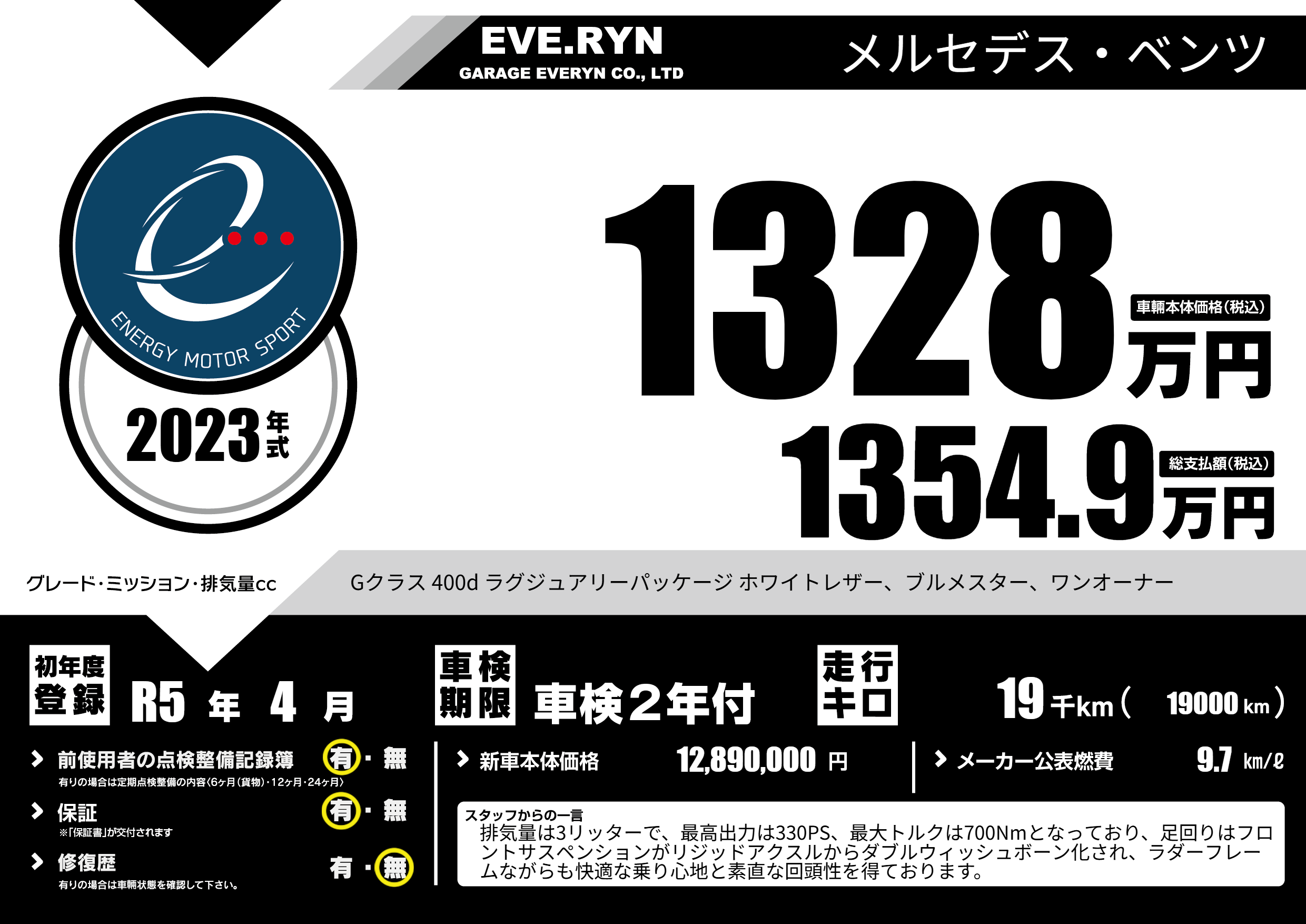 | 走行キロ | 1.9万km | 初年度登録 | R5年4月 |