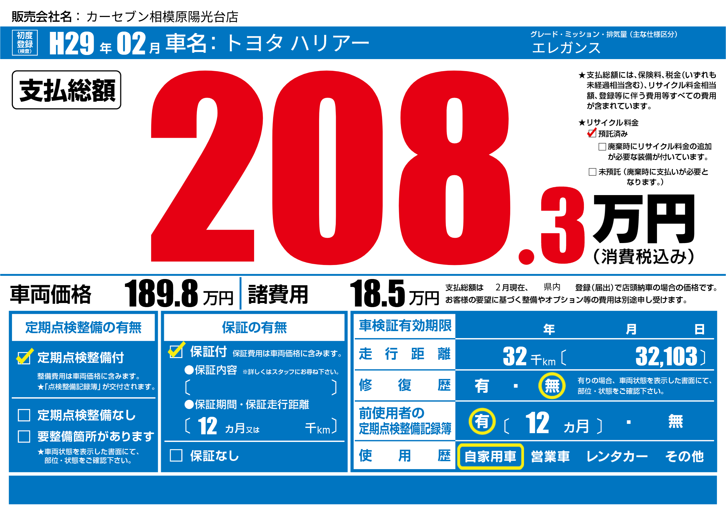 | 車名 | トヨタ ハリアー | グレード ミッション 排気量 |