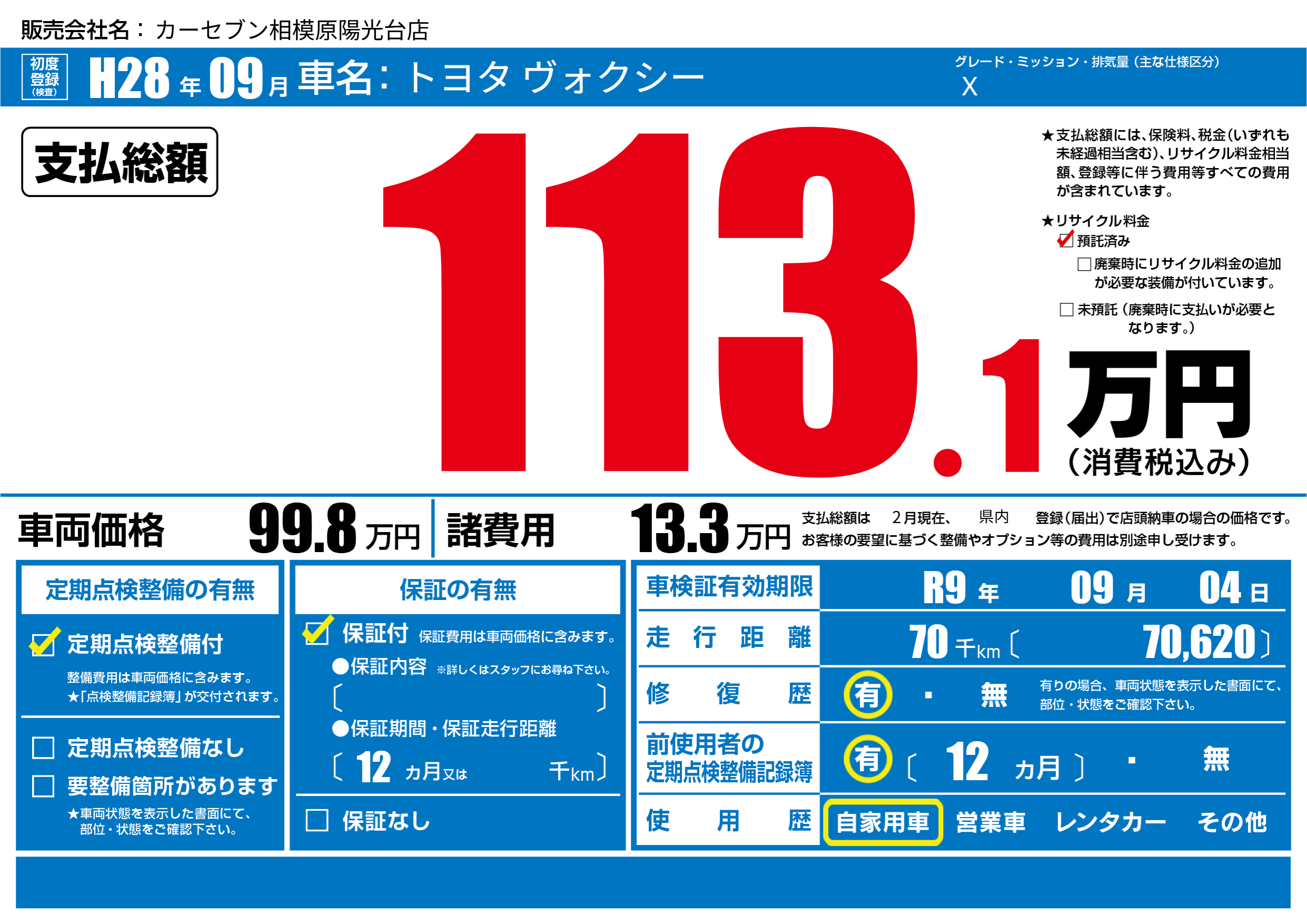| 走行キロ | 7万km | 初年度登録 | H28年09月 |