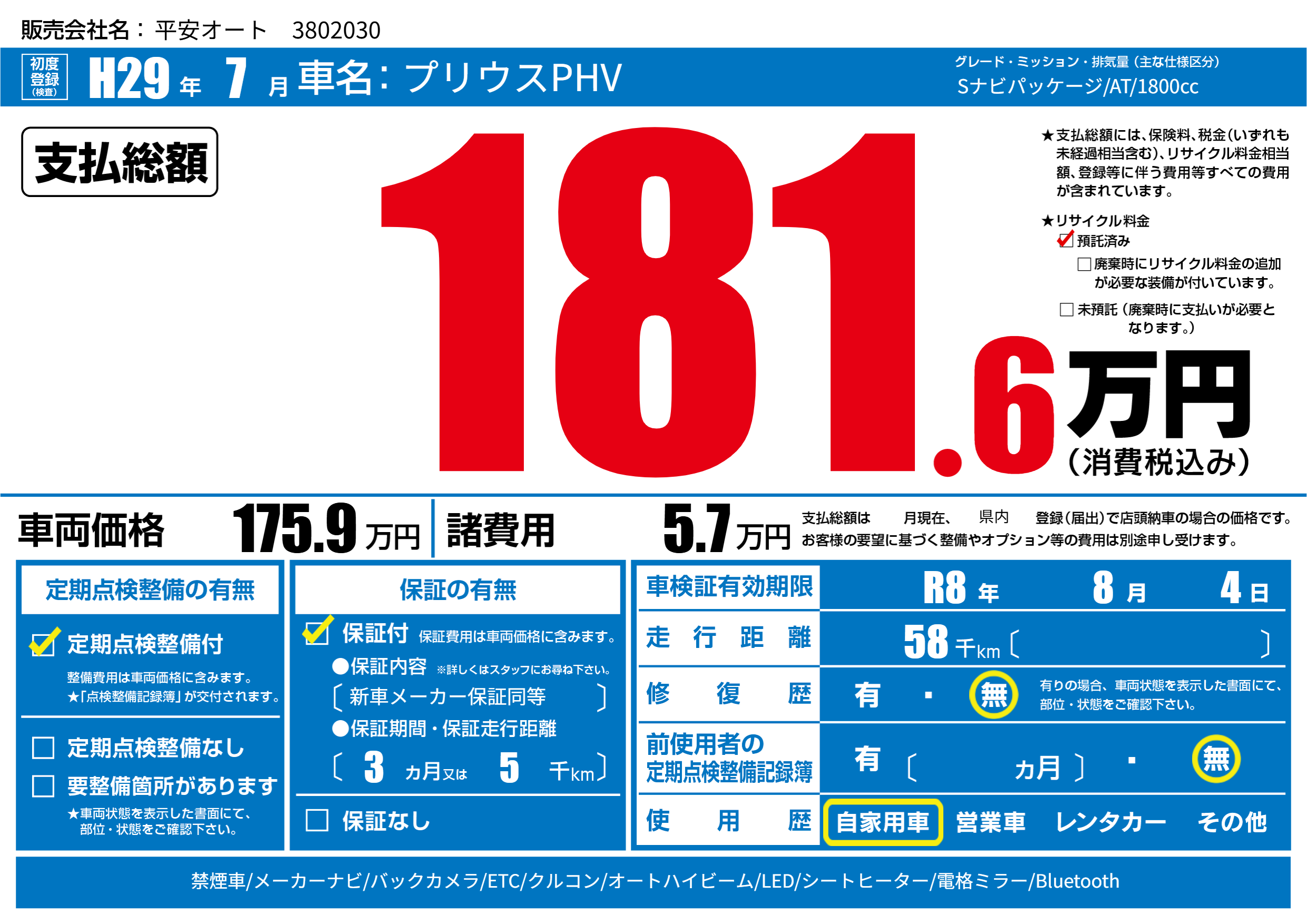| 車名 | プリウスPHV | グレード ミッション 排気量 |