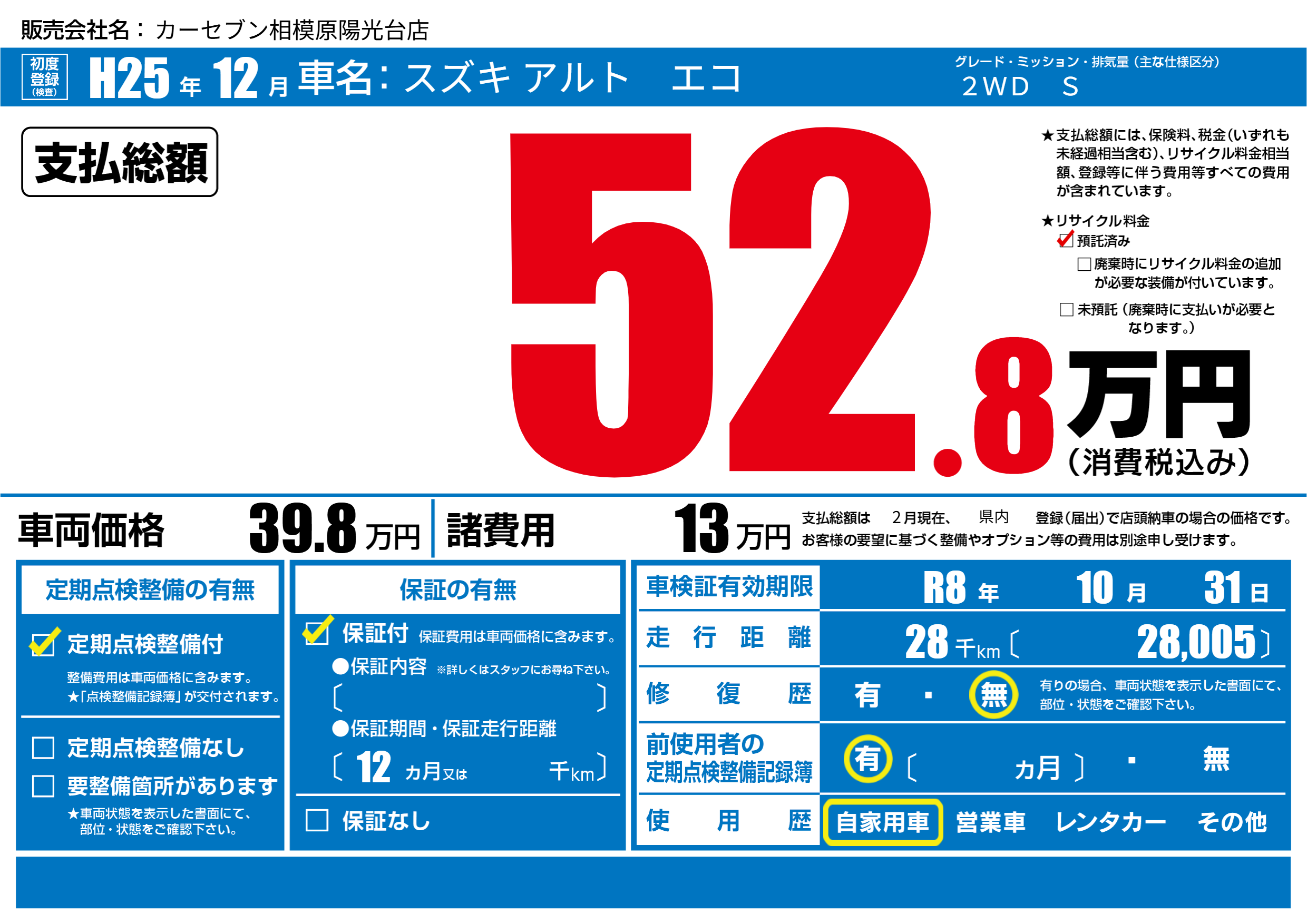 車検制限 R8年 10月 31日