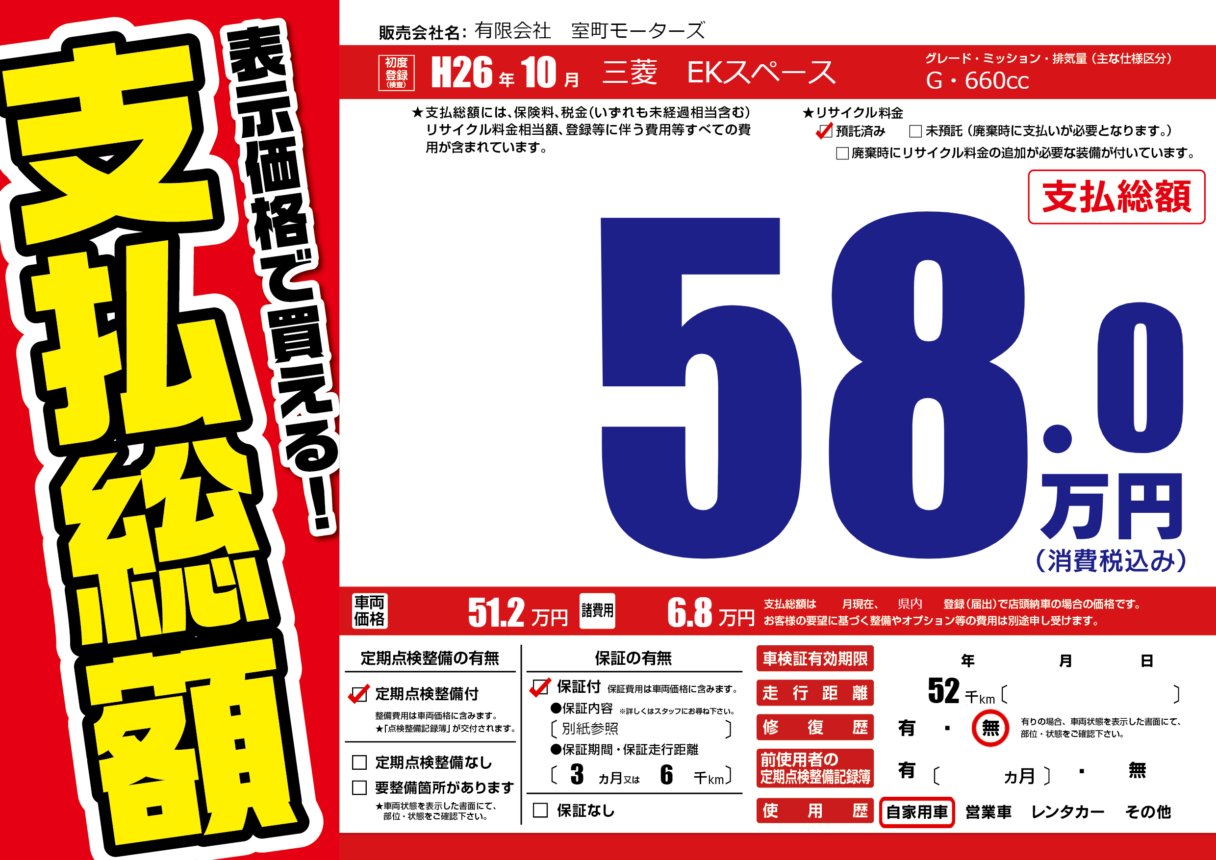 保証付き 保証内容(別紙参照) 3ヶ月または(6)千kmまで |
