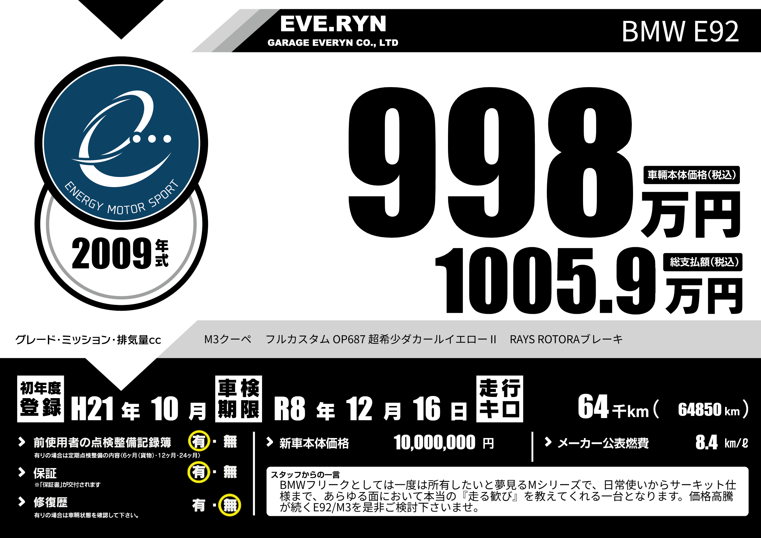 M3クーペ フルカスタム OP687 超希少ダカールイエローⅡ RAYS ROTORAブレーキ |