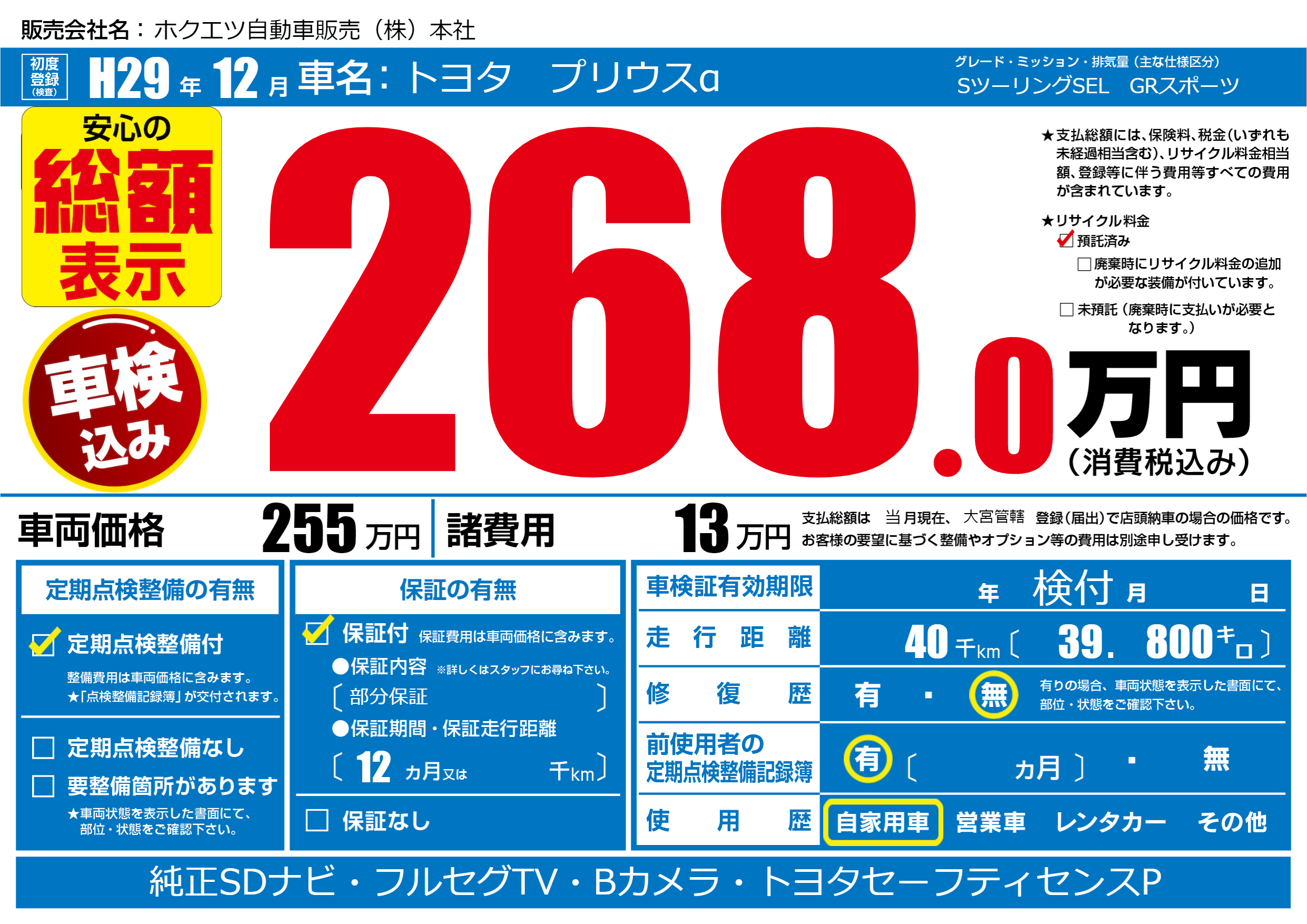 | 車名 | トヨタ プリウスα | グレード ミッション 排気量 |
