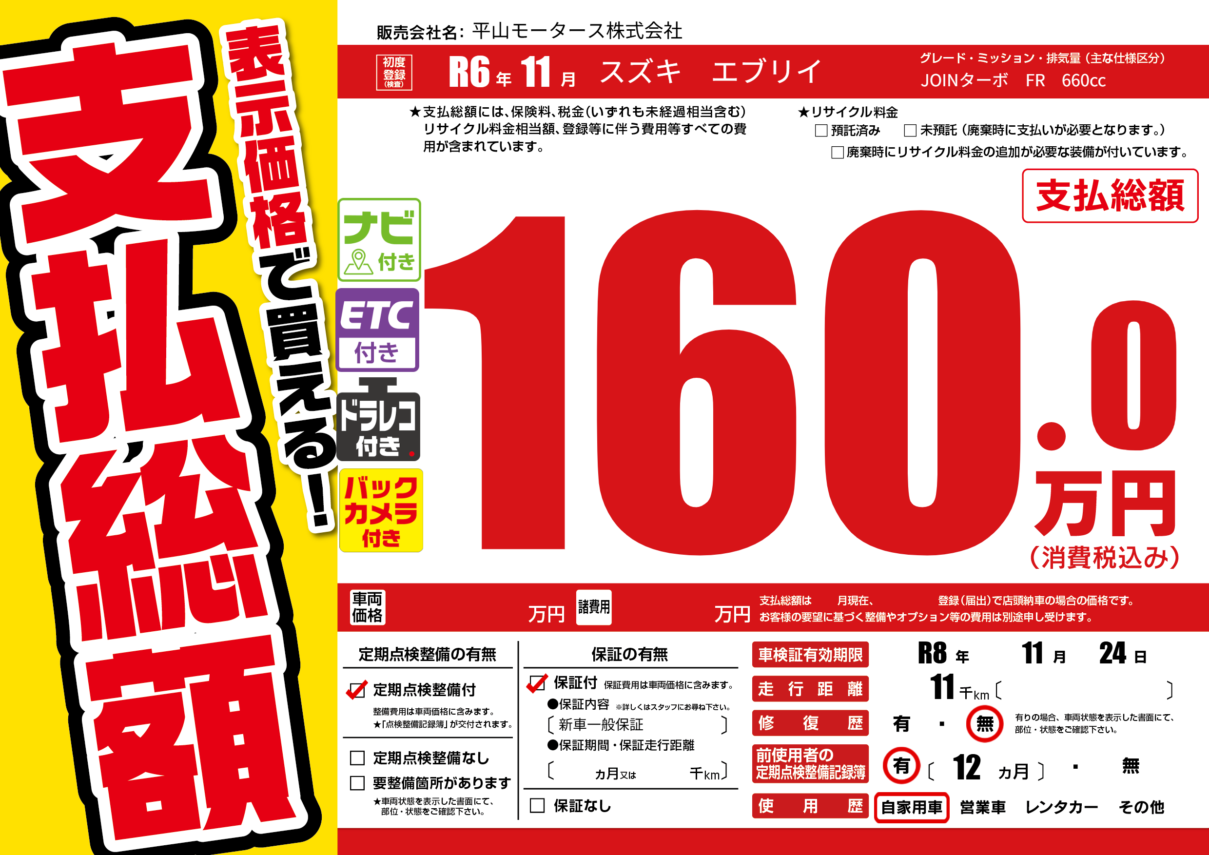 | 走行キロ | 1.1万km | 初年度登録 | R6年11月 |