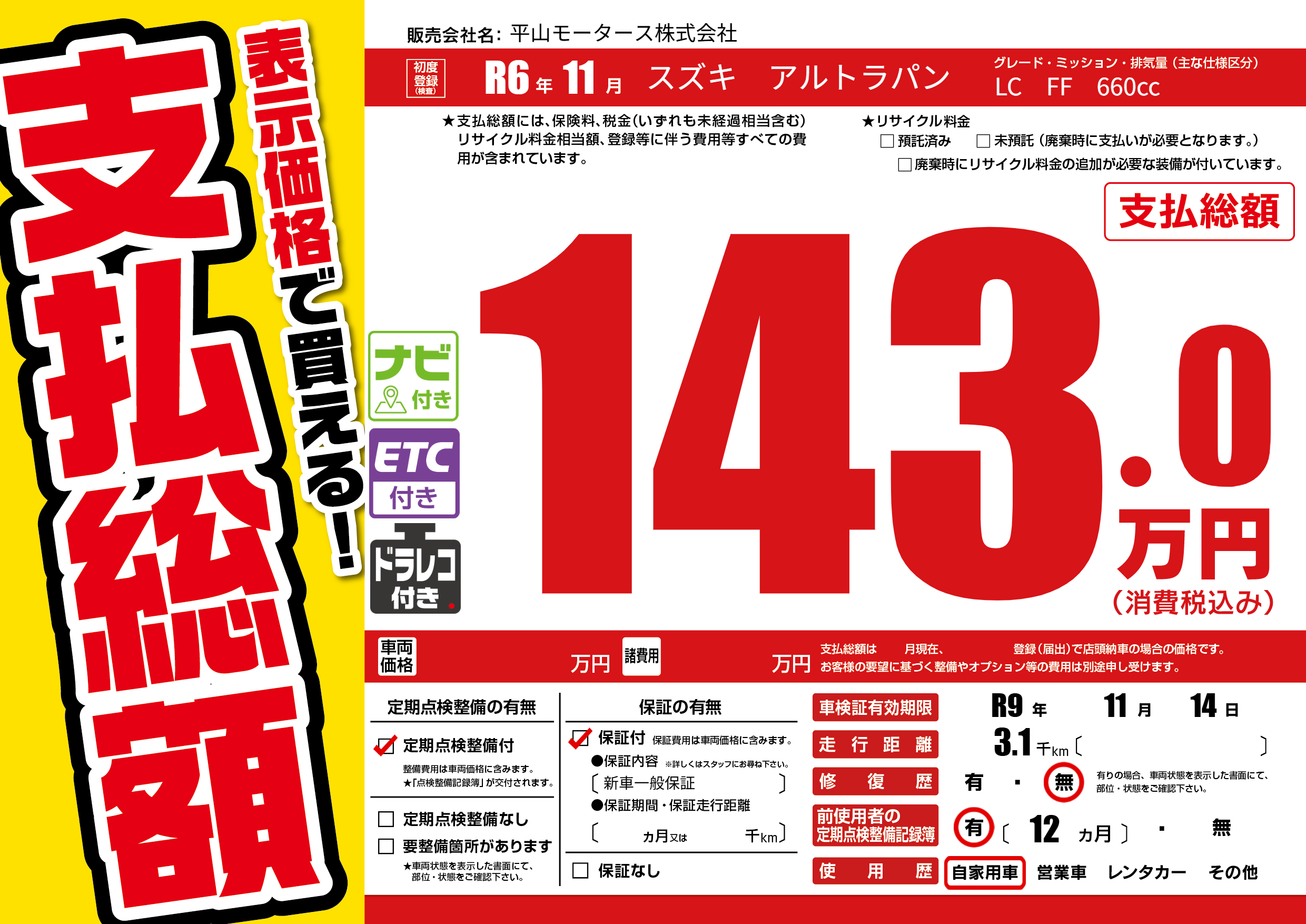 | 走行キロ | 0.3万km | 初年度登録 | R6年11月 |