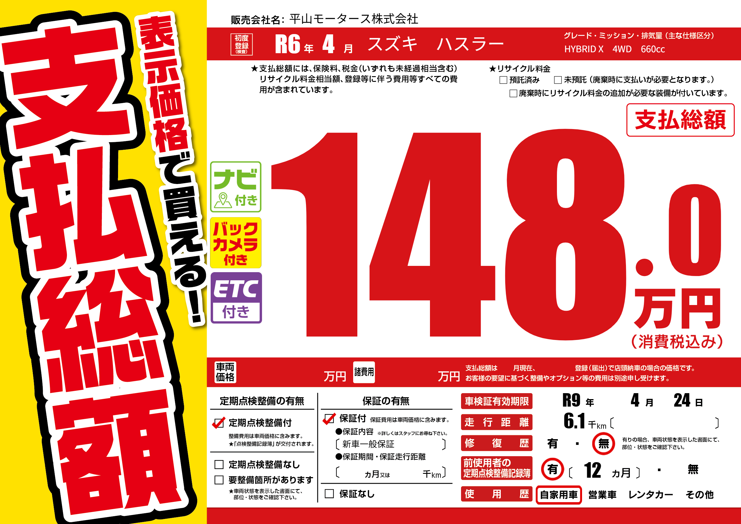 | 走行キロ | 0.6万km | 初年度登録 | R6年4月 |
