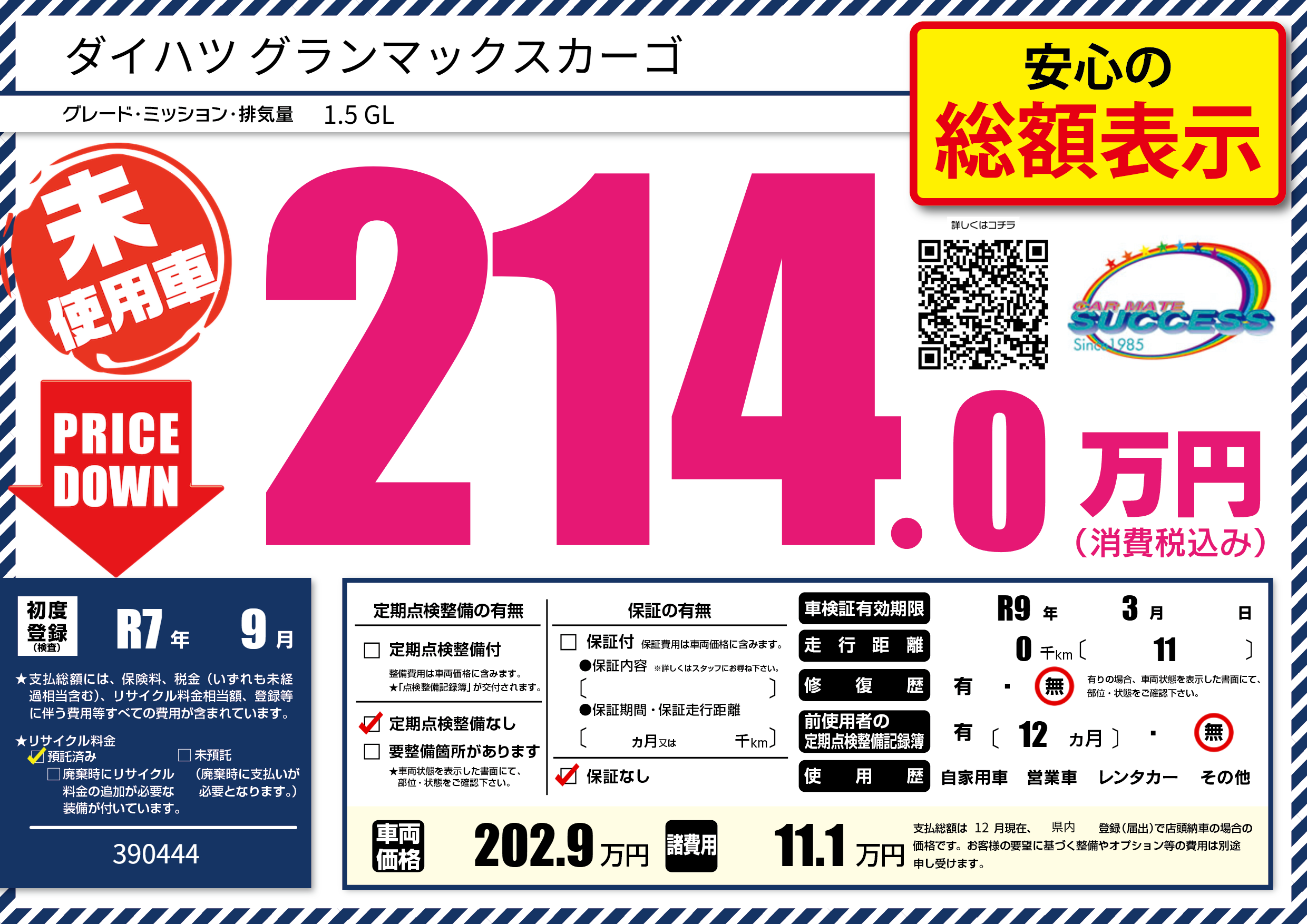 | 車名 | ダイハツ グランマックスカーゴ | グレード ミッション 排気量 |