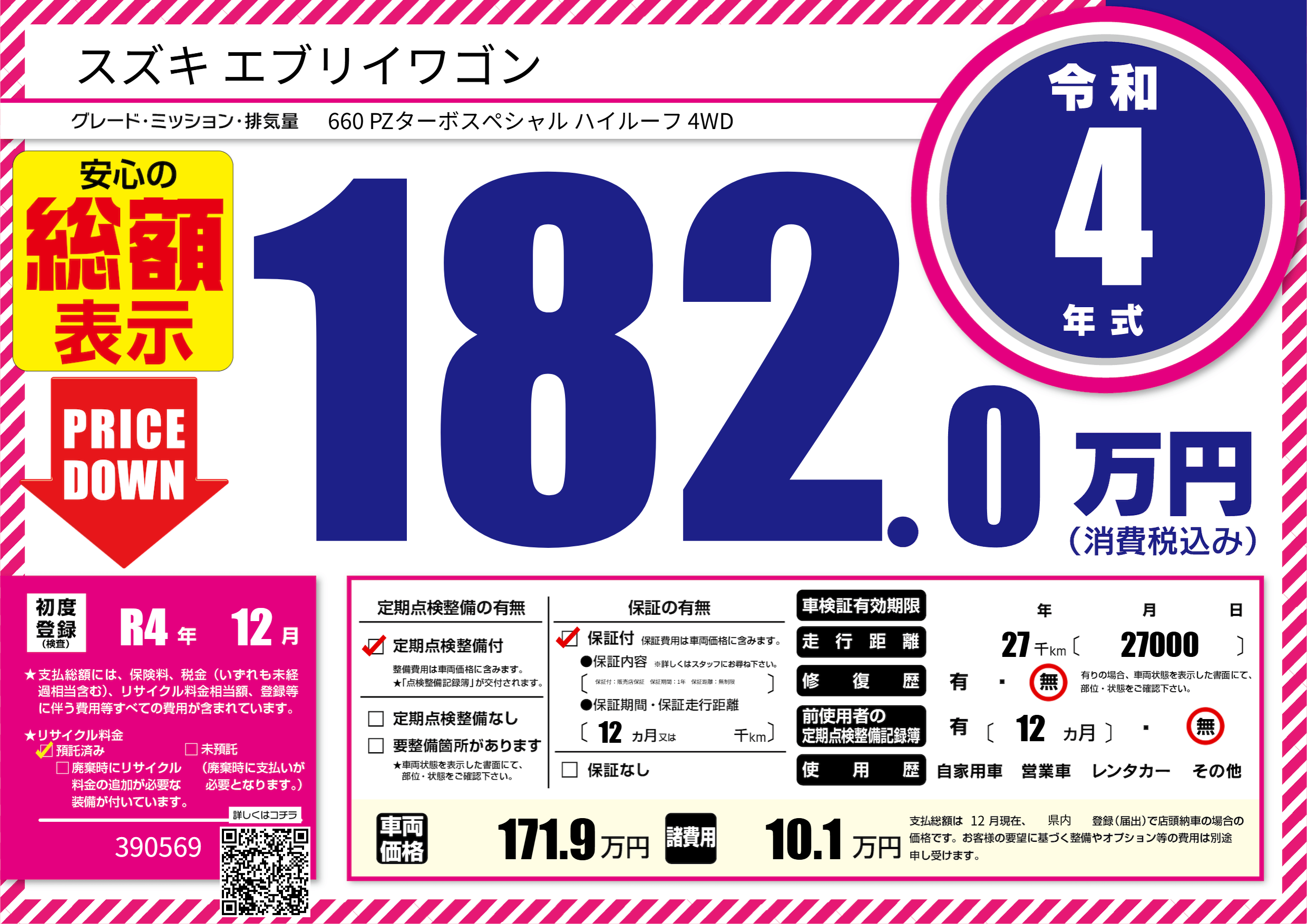 | 車名 | スズキ エブリイワゴン | グレード ミッション 排気量 |